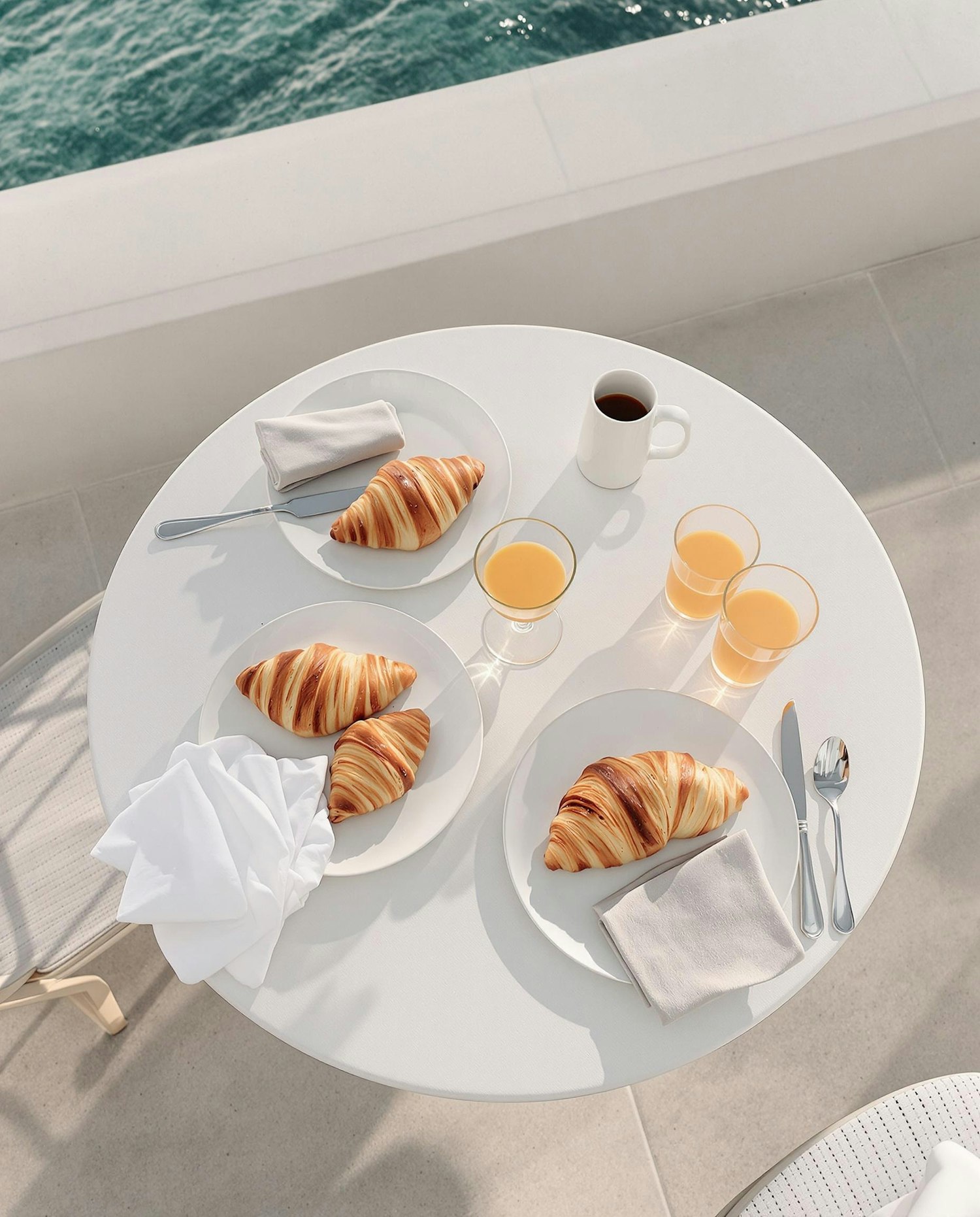 Elegant breakfast setup with croissants, orange juice, and coffee on a white table by the sea, perfect for a serene morning vibe.