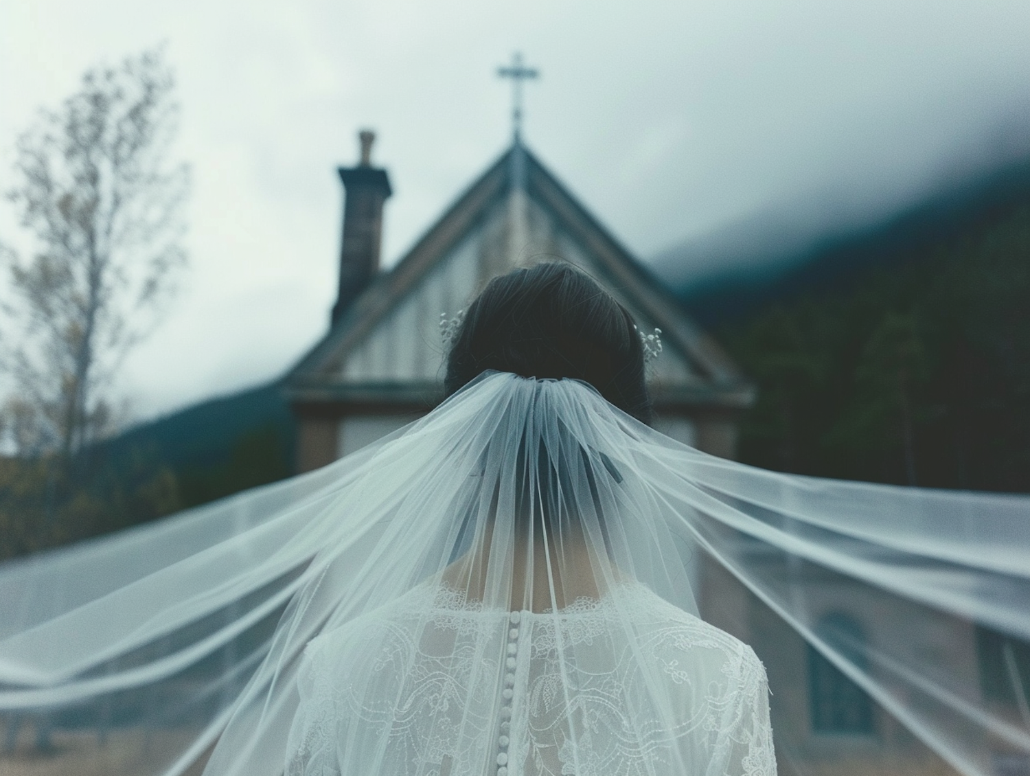 Bride with flowing veil stands before a rustic church, creating a serene and atmospheric wedding scene.