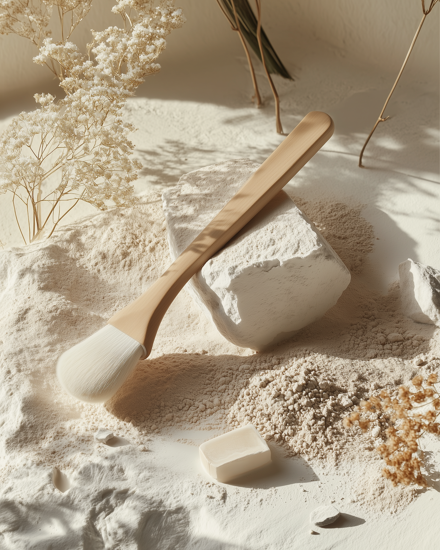 A wooden brush on a textured powder surface with dried flowers and stones, creating a natural, earthy aesthetic.