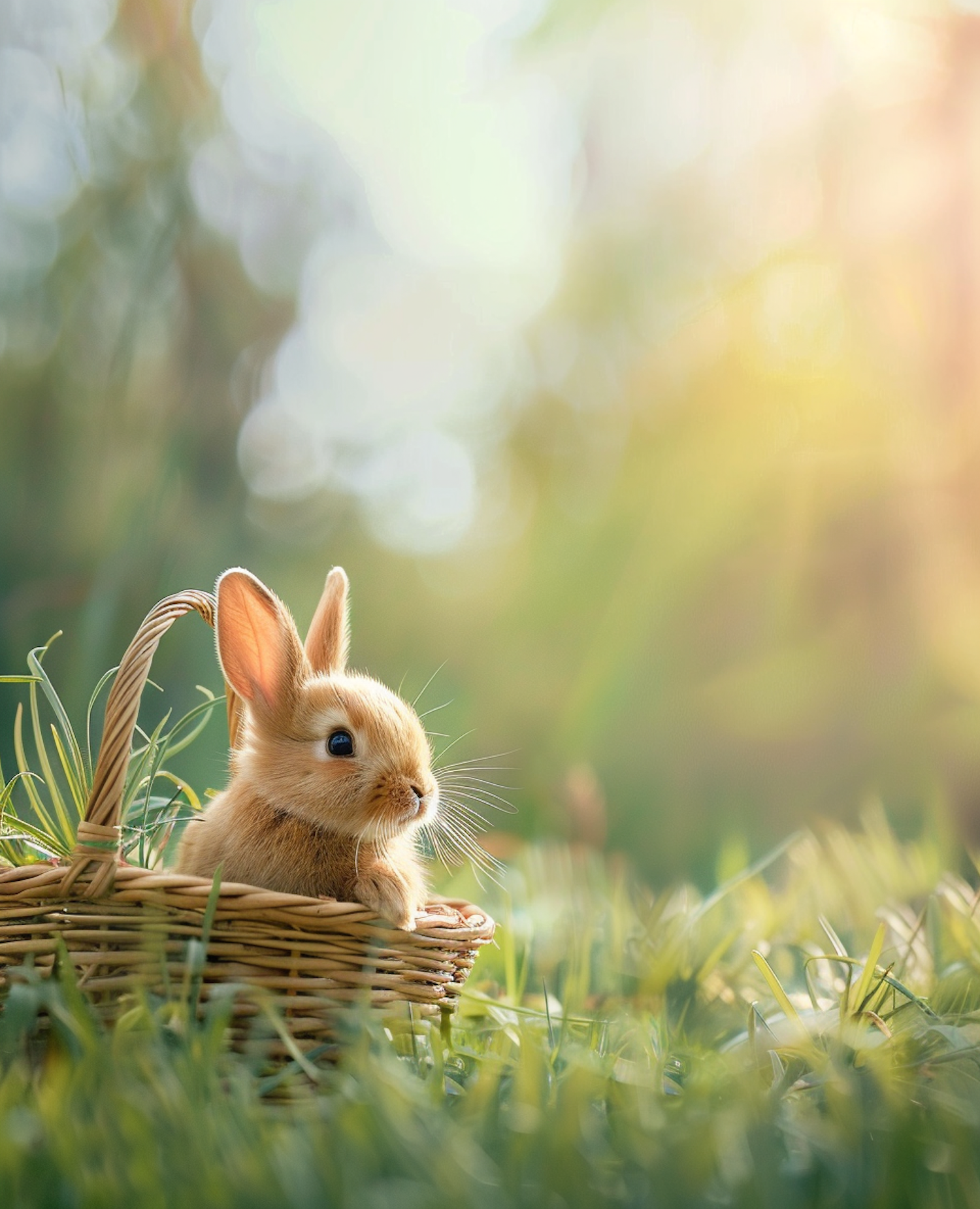 Adorable brown rabbit in a basket surrounded by green grass and warm sunlight, creating a peaceful and natural scene.