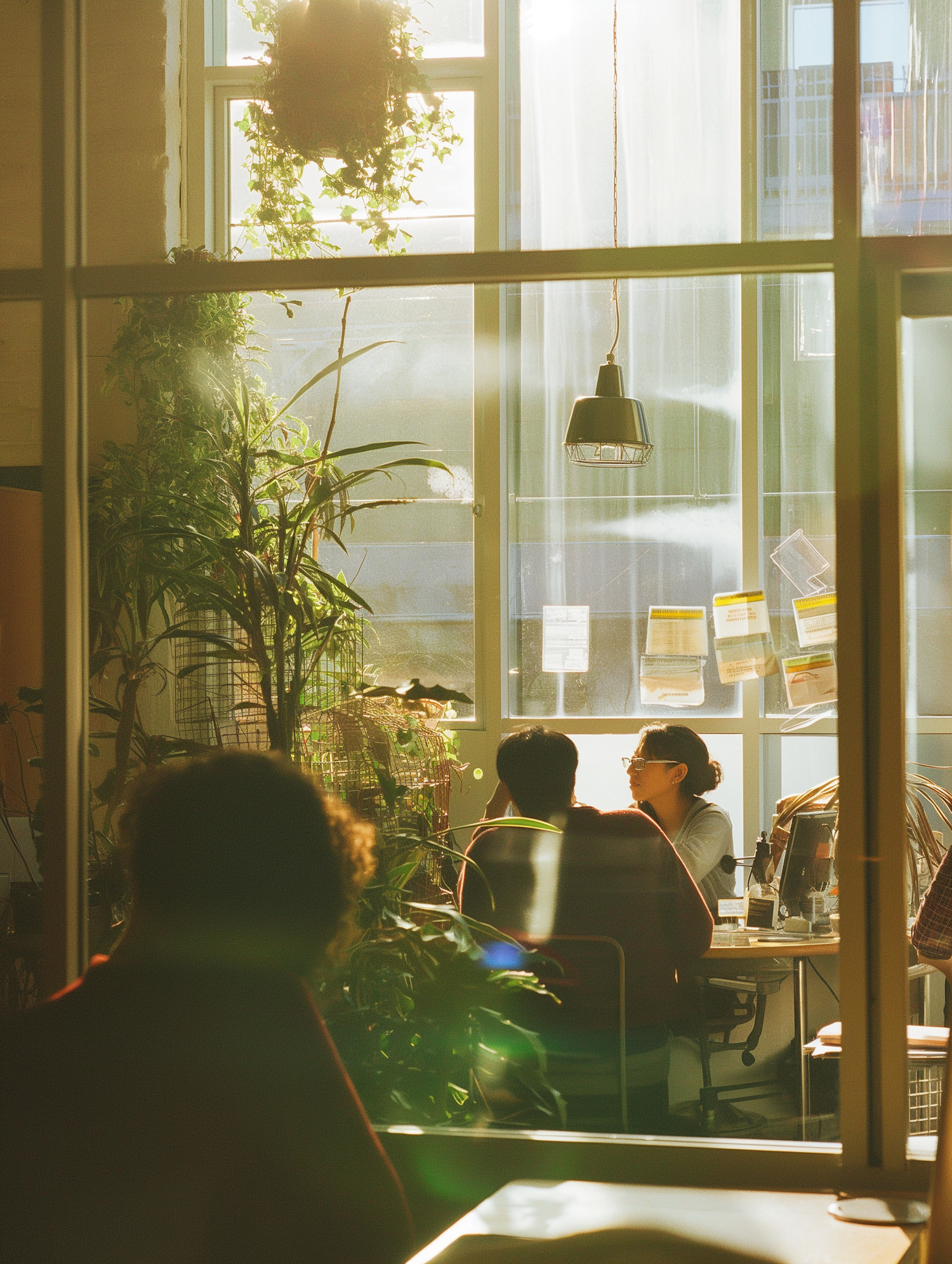 Cozy indoor scene with sunlight, lush plants, and two people in conversation, creating a serene and inviting atmosphere.