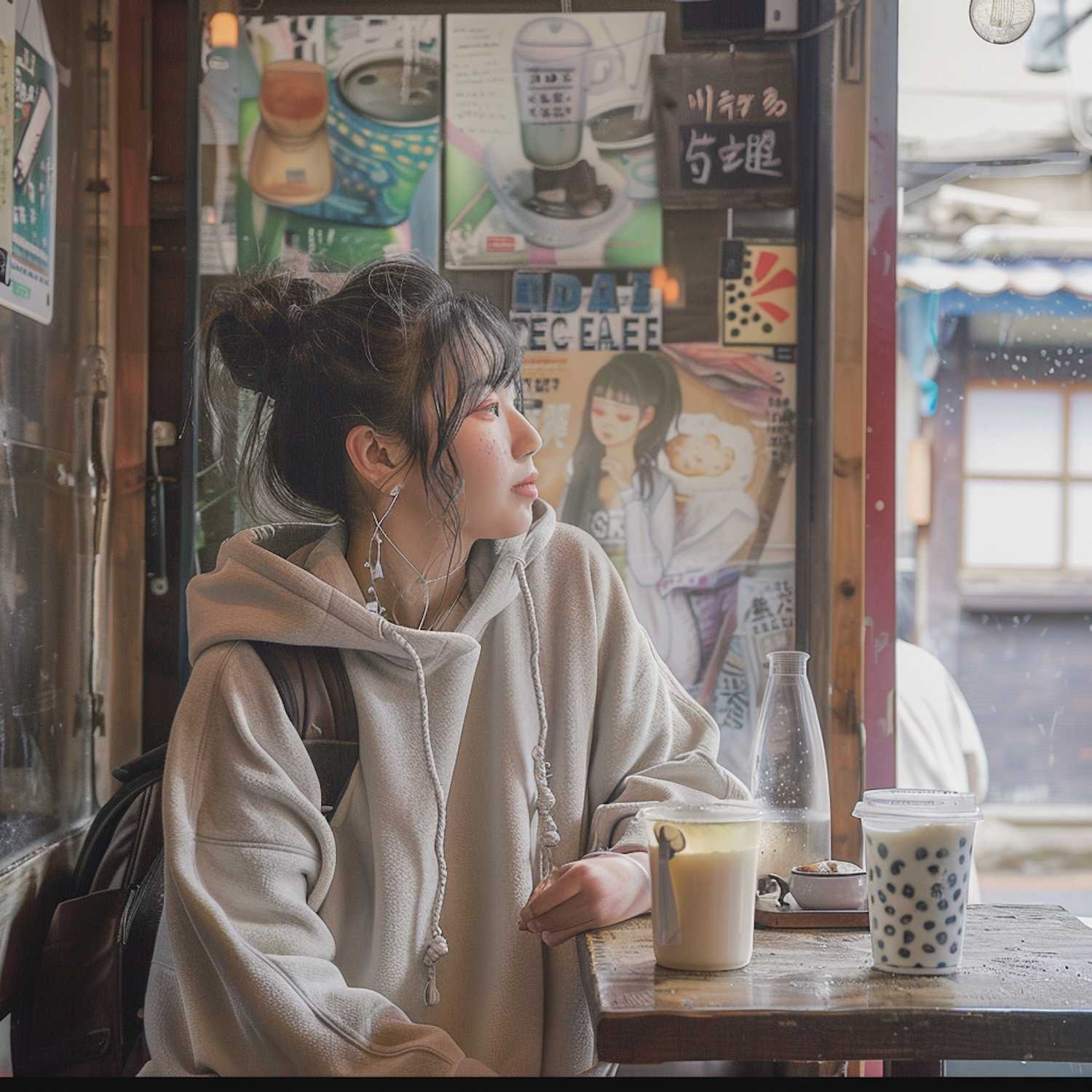 Asian woman in cozy cafe with milk tea, wearing gray hoodie, gazing out window. Warm ambiance with colorful posters.