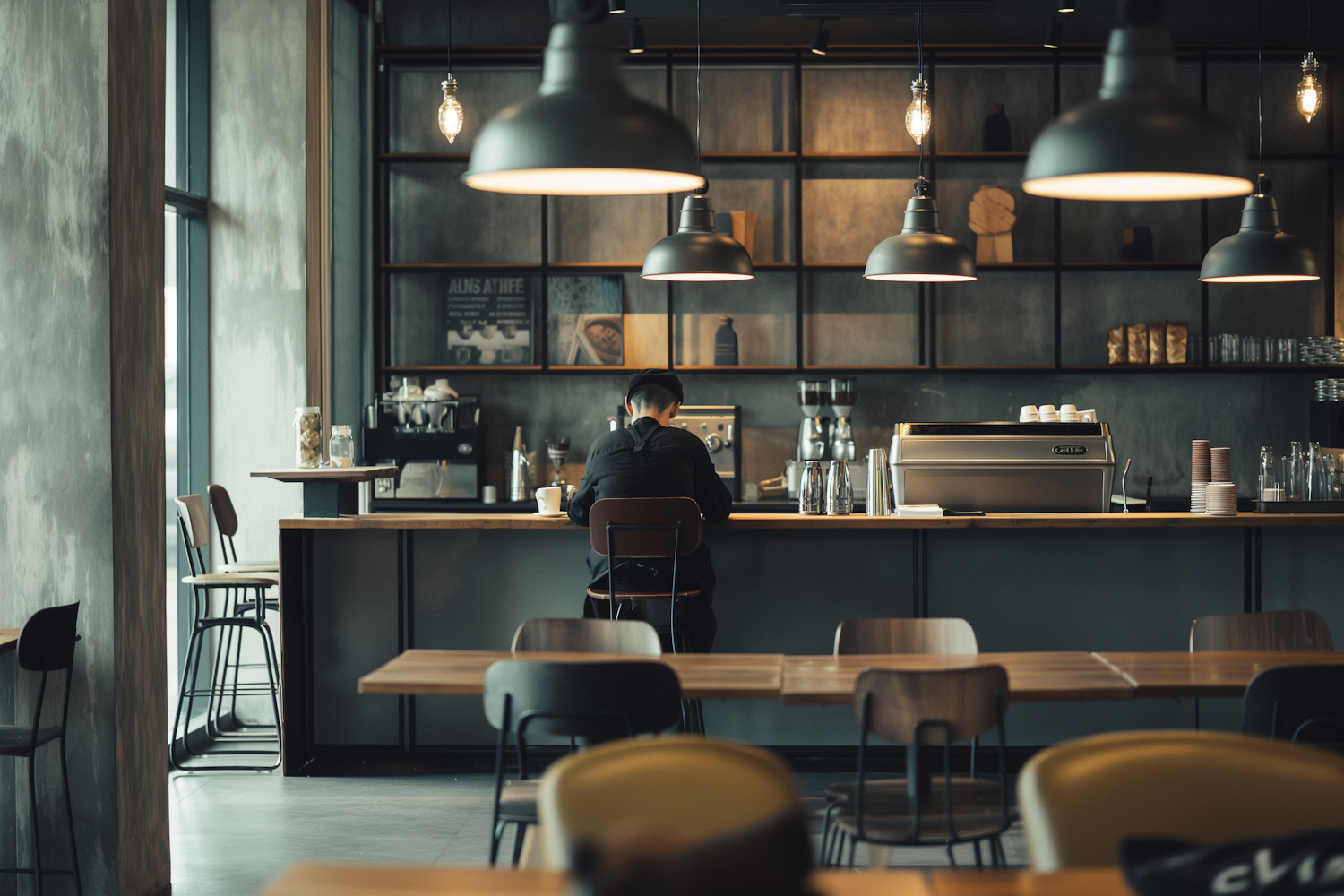 Cozy coffee shop with industrial decor, a lone man at the counter, and warm lighting creating an inviting atmosphere.