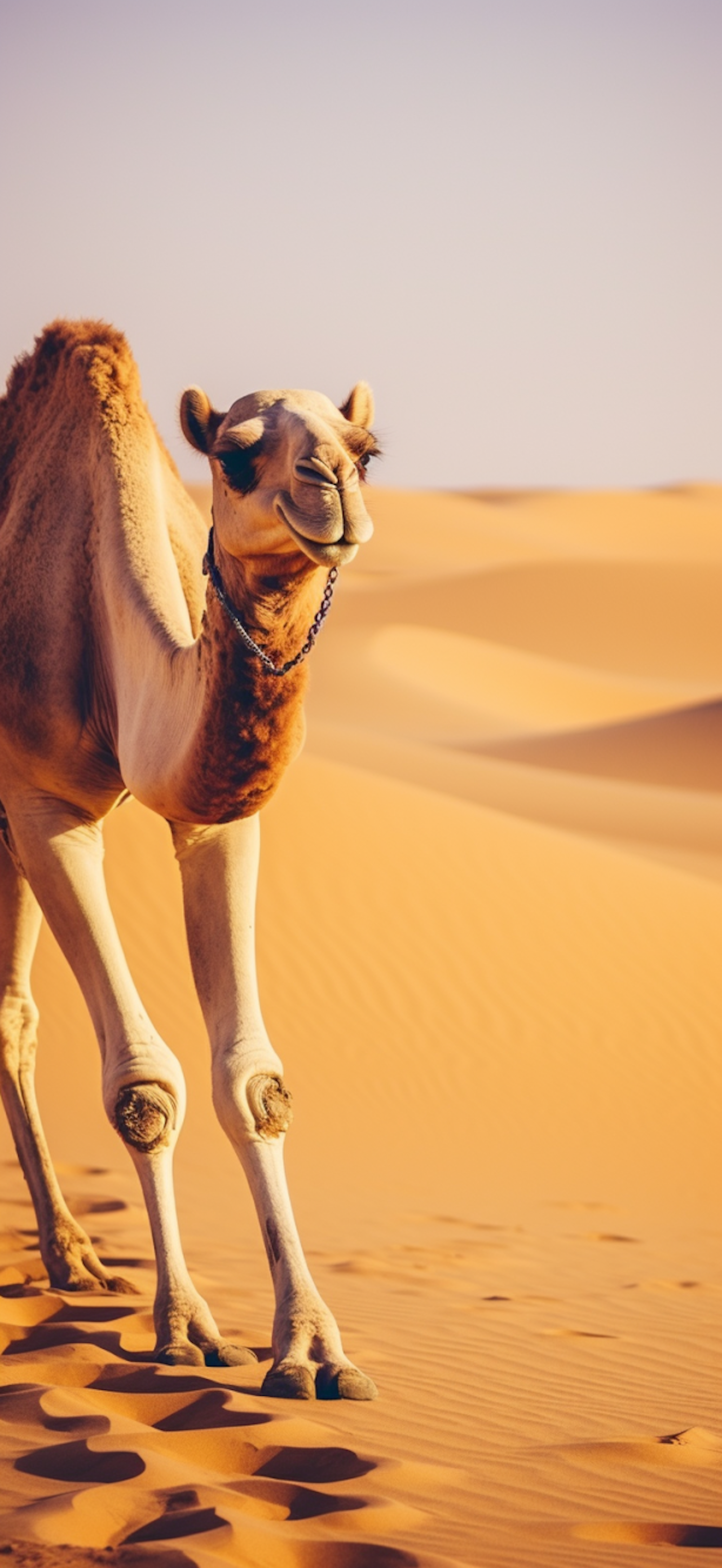 A serene camel in golden desert sands with rippling dunes and a clear sky, showcasing the beauty of the arid landscape.
