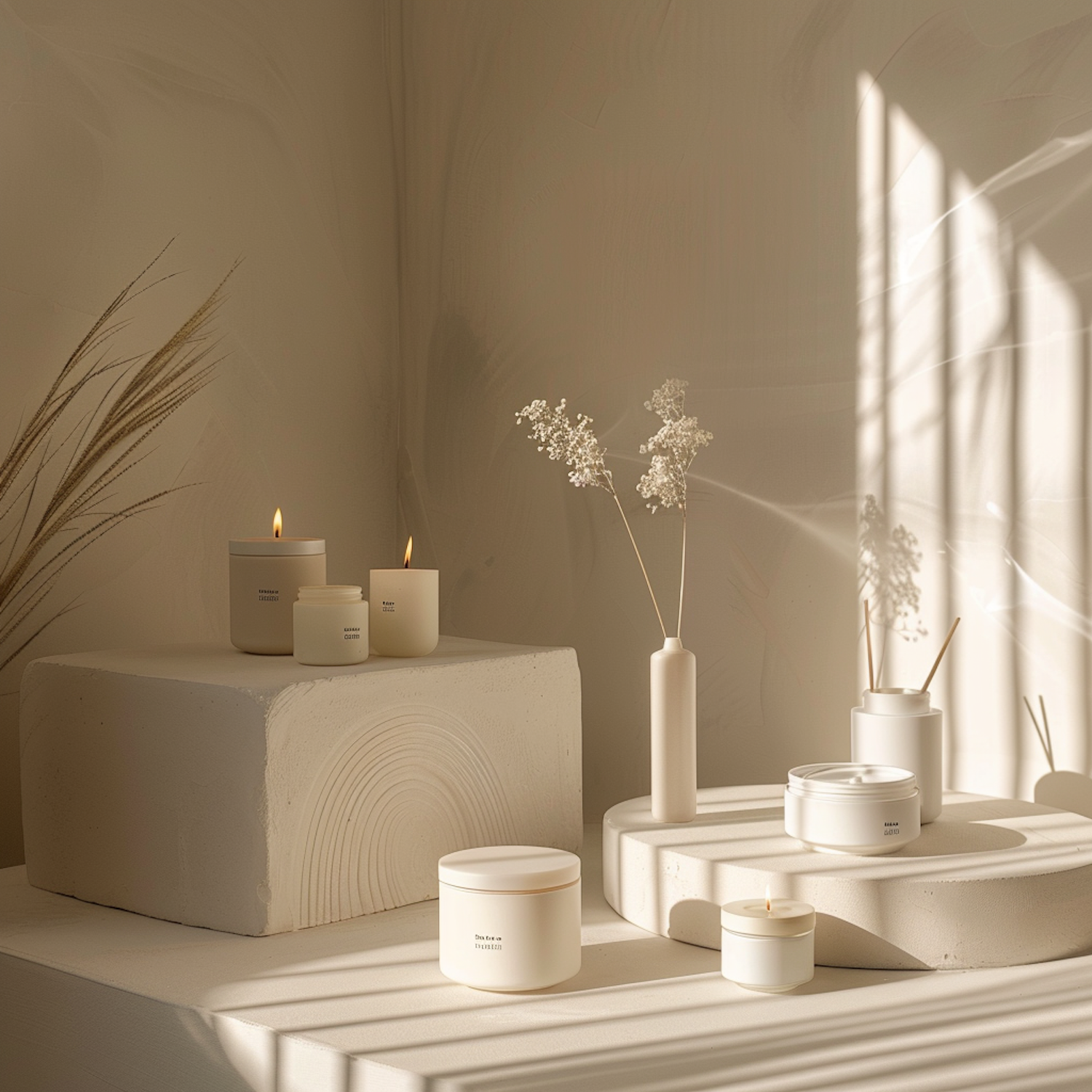 Minimalist scene with lit candles and vases on geometric platforms, casting warm shadows in a serene, sunlit setting.