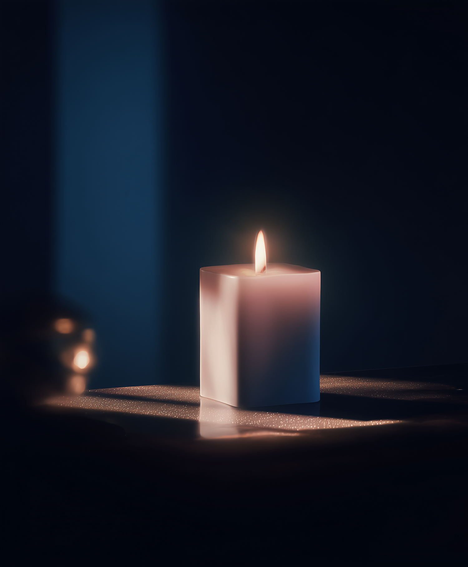 A lit white square candle on a reflective surface in a dimly lit room, creating a serene and tranquil atmosphere.