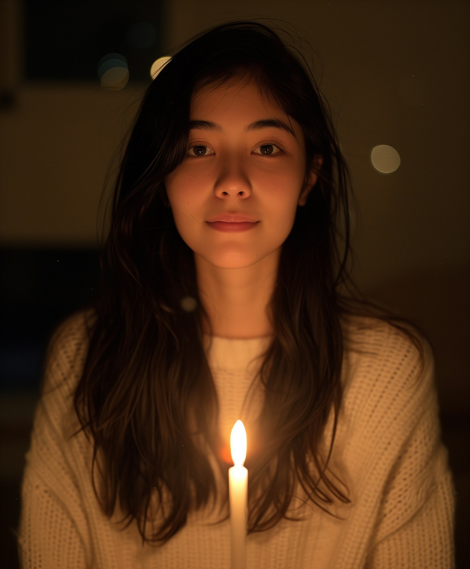 A serene portrait of a young woman holding a candle, casting a warm glow on her face in a dimly lit room.