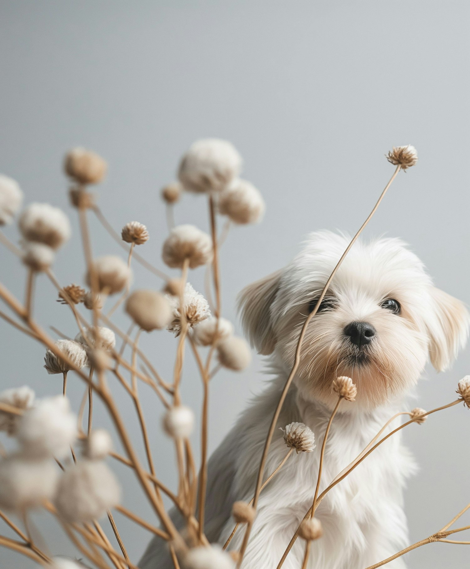 Adorable white dog peeking through dried flowers, creating a serene and charming scene with neutral tones and soft textures.