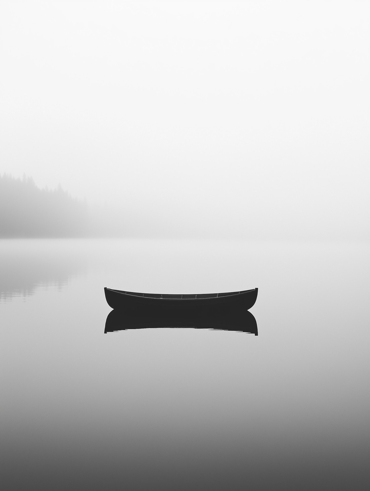 Minimalist black-and-white photo of a canoe on a foggy, still lake with faint forest outlines in the background.
