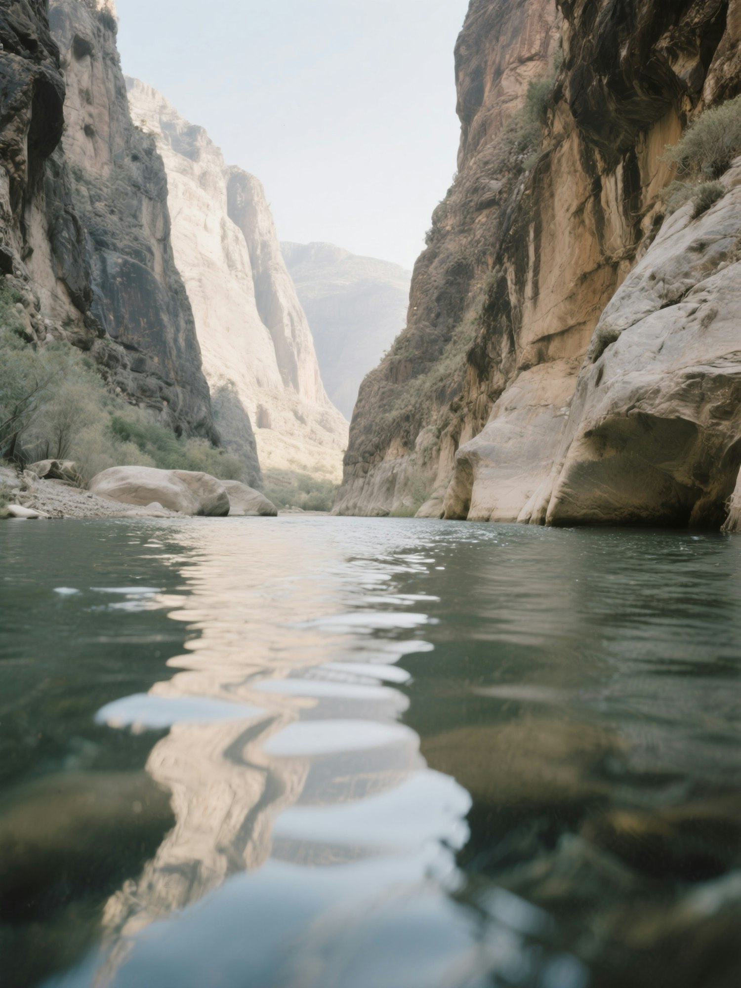 Soft natural light, muted faded colors, desaturated tones, light and airy palette, visible film grain, cinematic composition, candid imperfect capture, off-center framing, artistic angles, lifestyle photography, dreamy atmosphere, high resolution, realistic textures, slight blur or motion imperfections, soulful timeless aesthetic — canyon water view from just above water level, rock walls towering on each side, reflection slightly blurred by gentle ripples