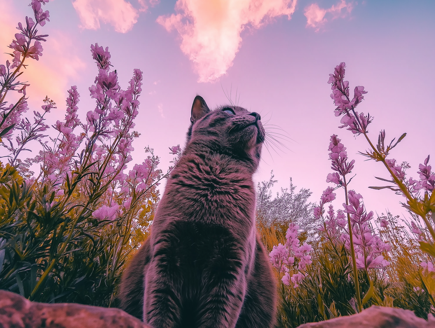A majestic tabby cat sits among tall pink flowers under a dreamy pink and blue sky, creating a serene and tranquil scene.