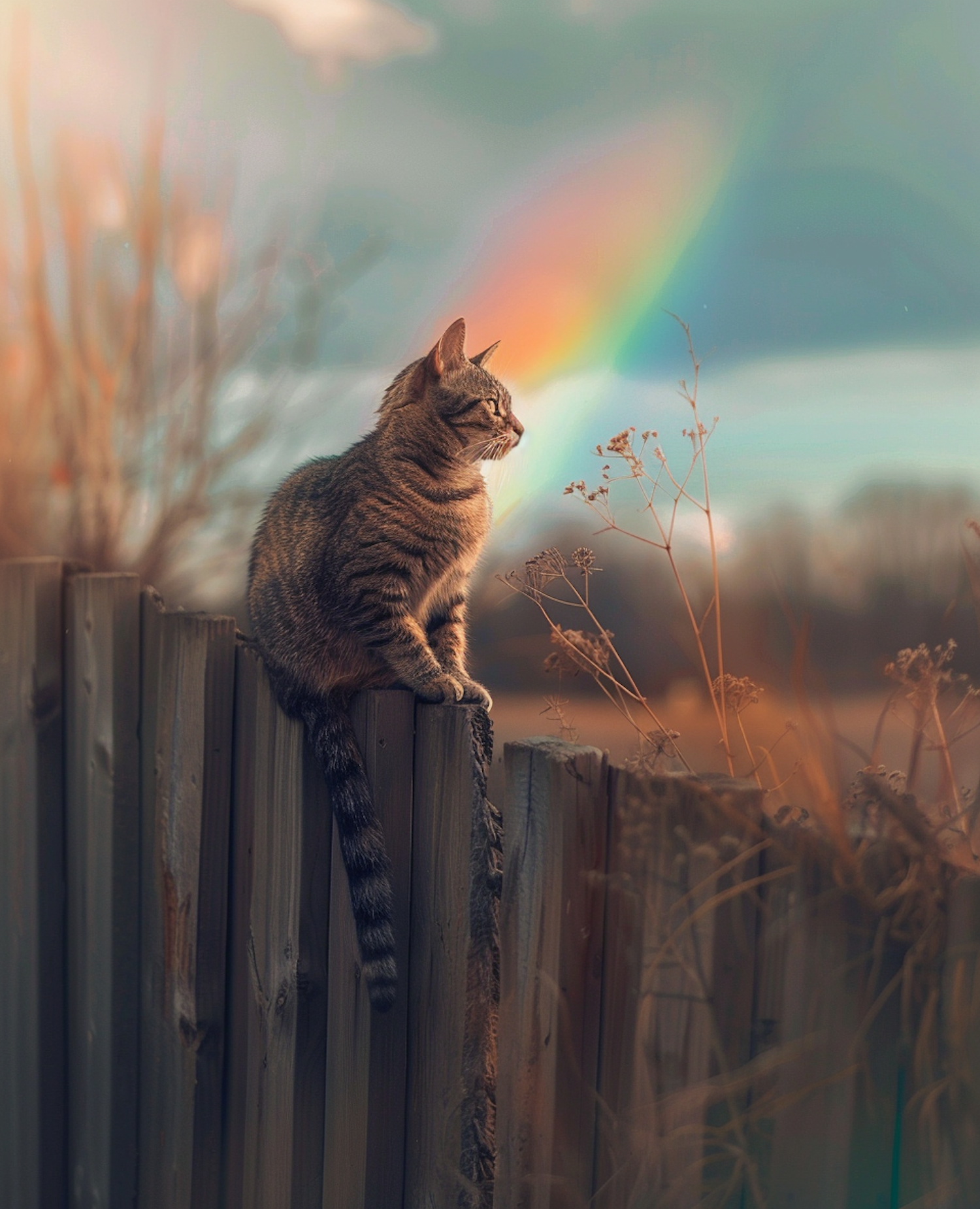 A tabby cat sits on a fence, gazing at a vibrant rainbow in a serene, dreamy landscape with warm lighting.
