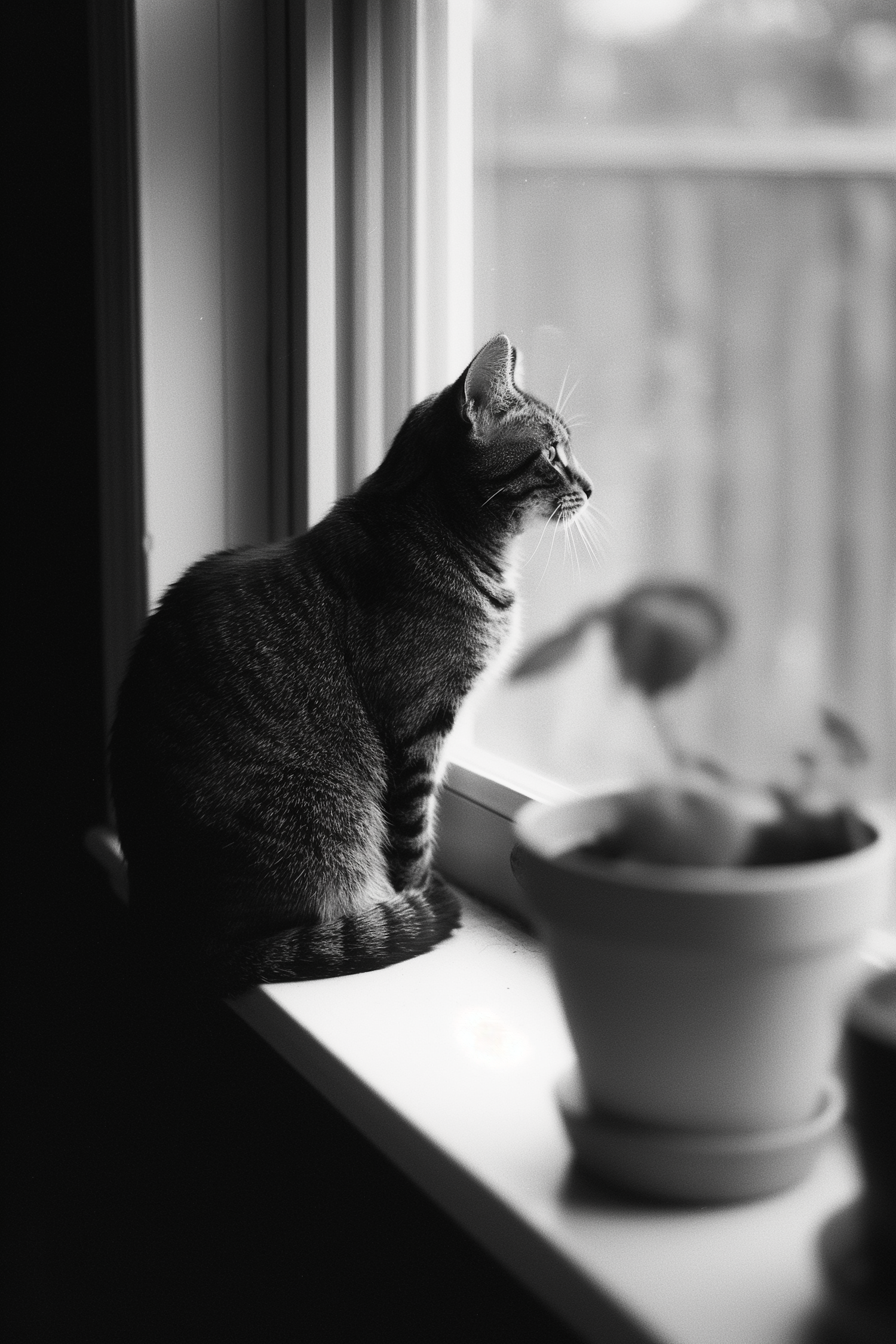 Black and white photo of a tabby cat on a windowsill, gazing outside with a potted plant nearby. Serene and contemplative scene.