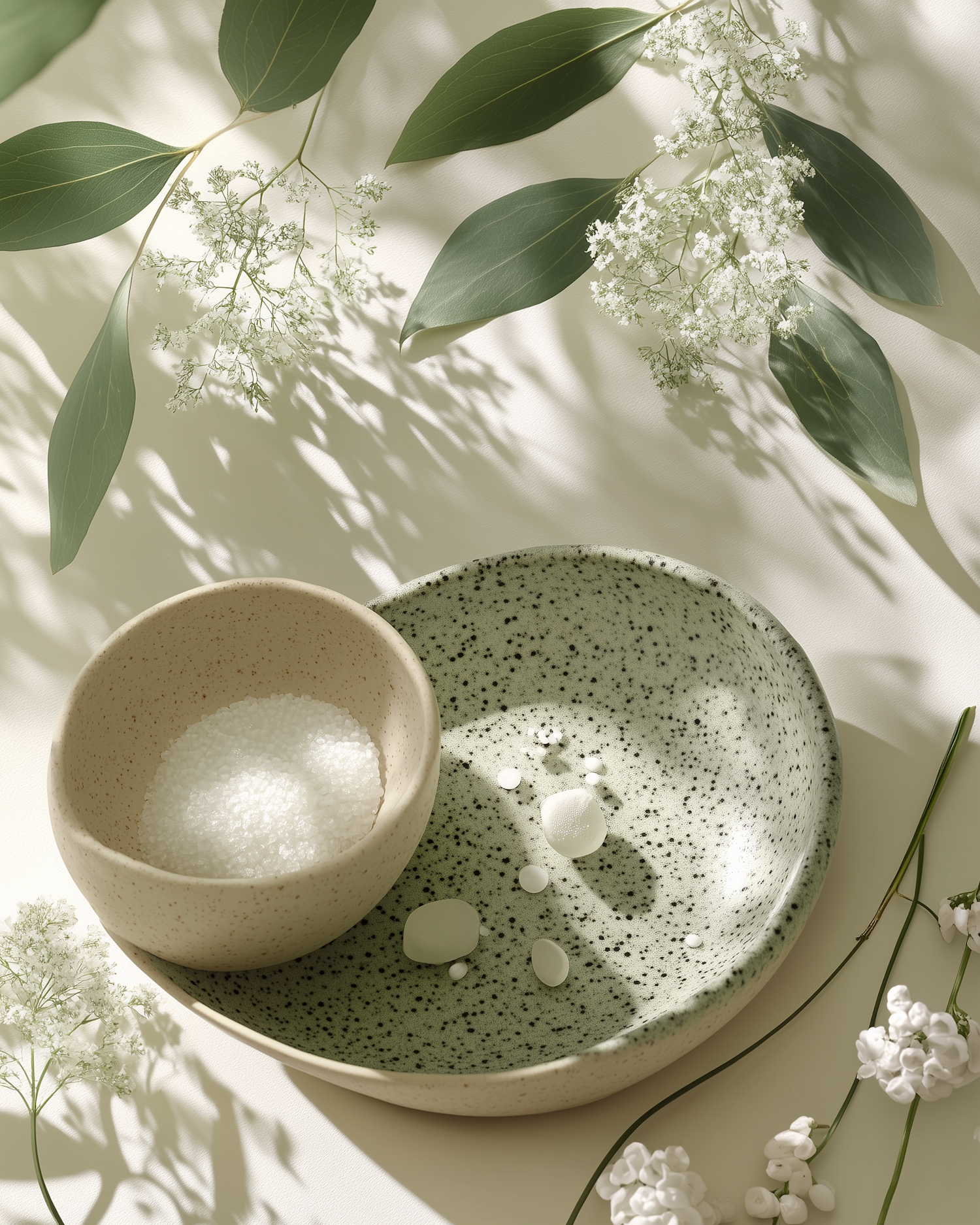 Minimalist ceramic bowls with white granules and beads, surrounded by green leaves and white flowers on a cream background.