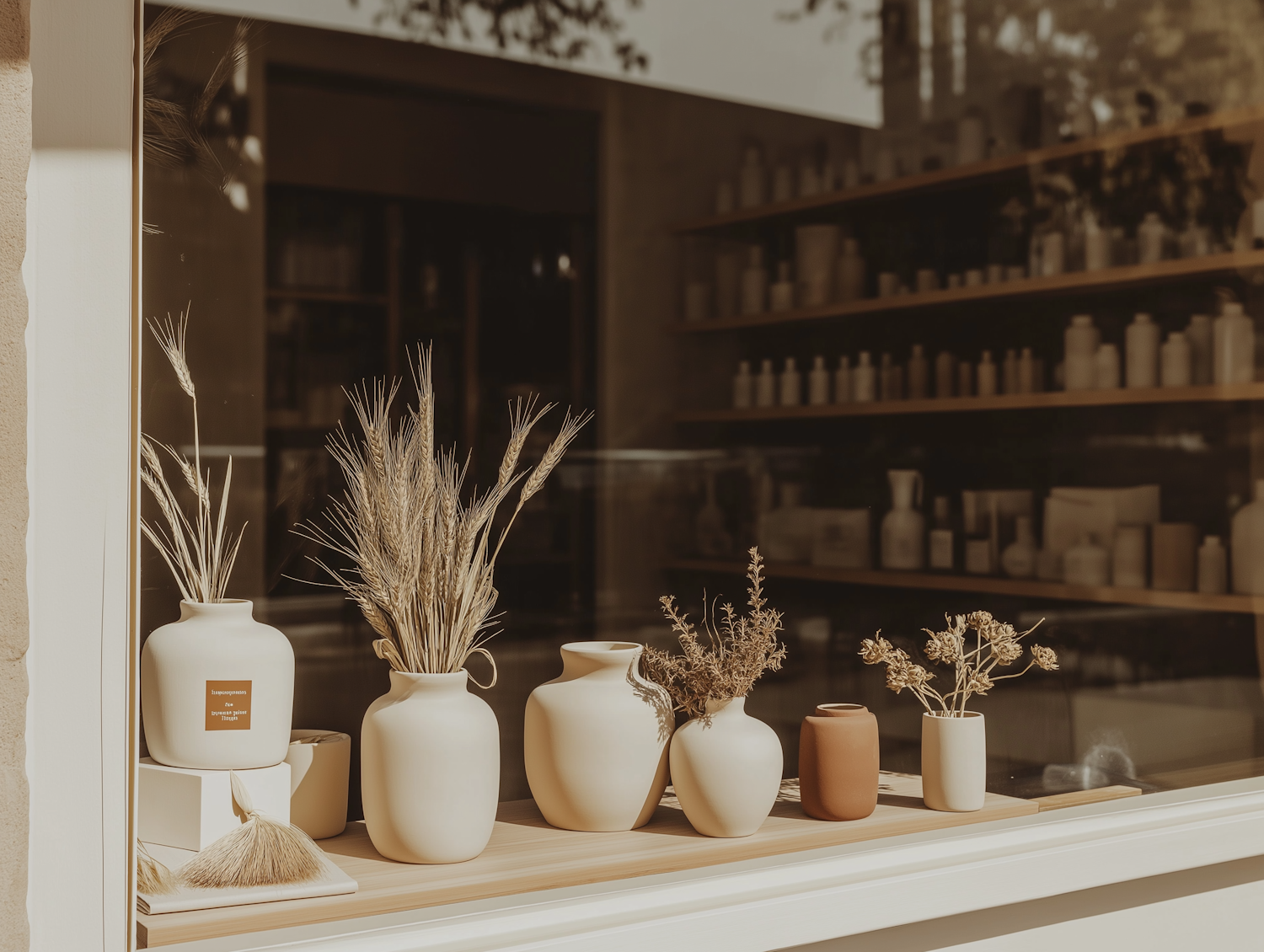 Elegant ceramic vases with dried plants in a shop window, creating a rustic and minimalistic display with warm, natural lighting.