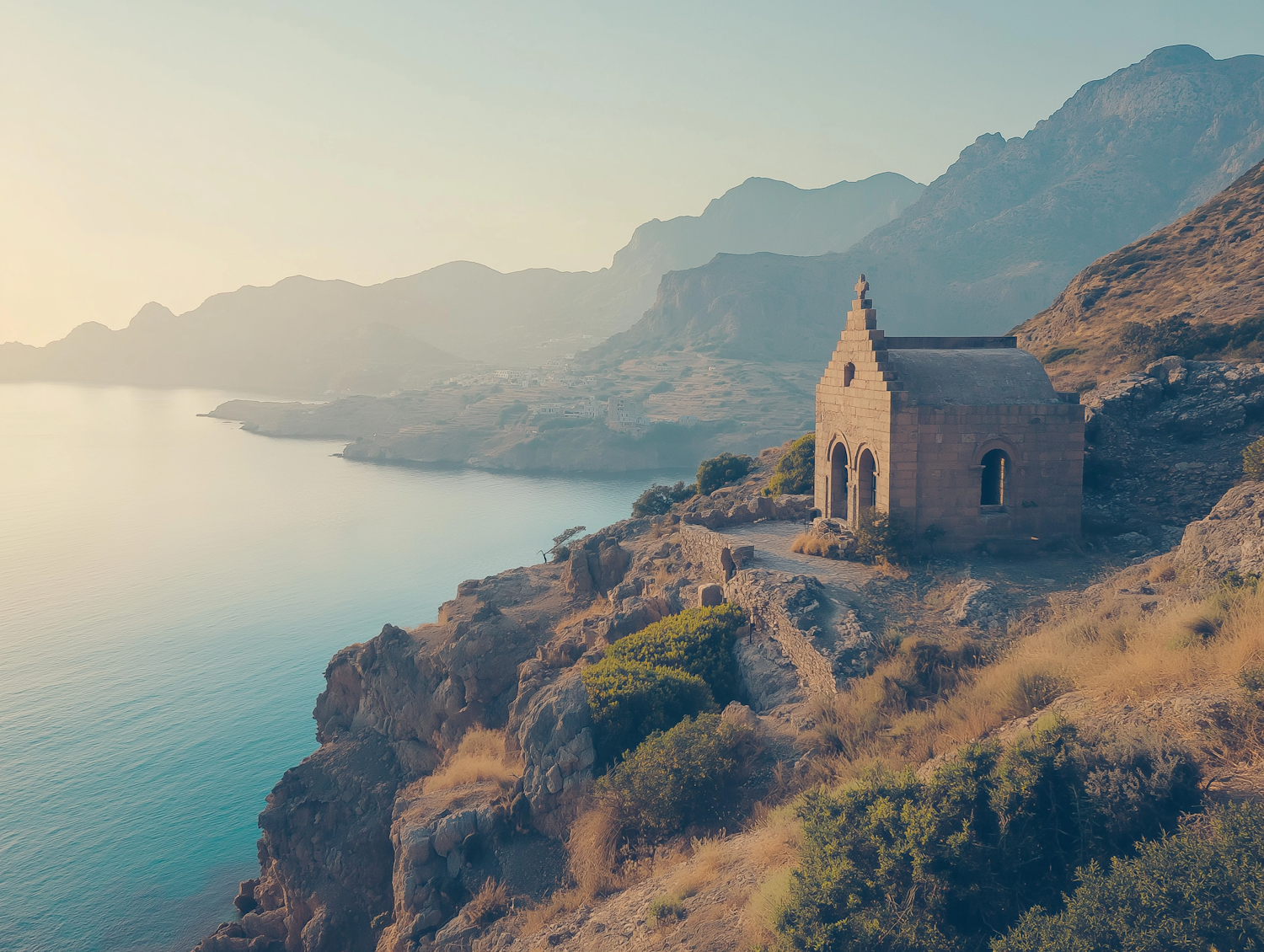 Ancient stone chapel on a cliff with serene water and mountain backdrop, bathed in soft golden light.