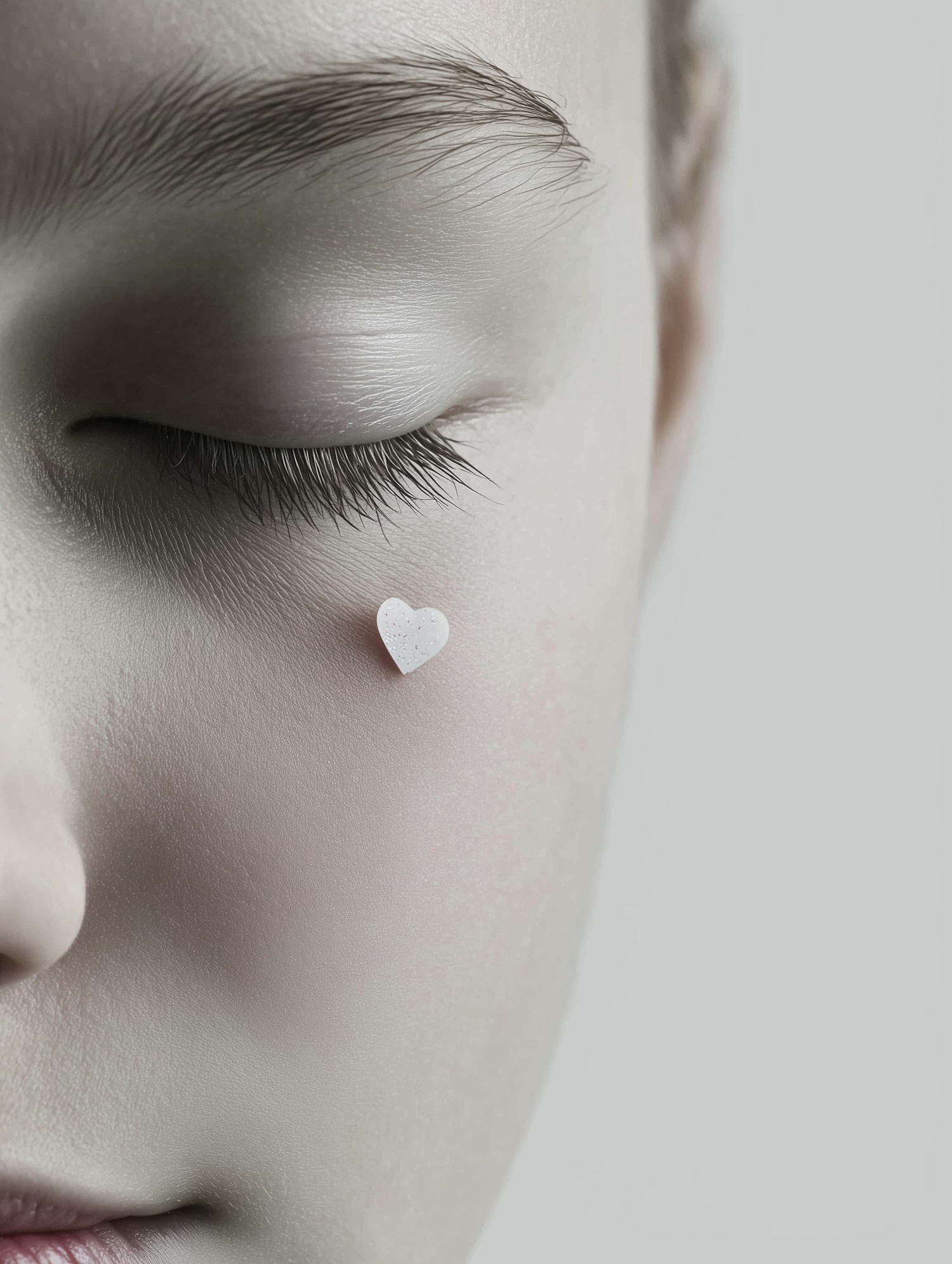 Close-up of a serene face with a white heart detail on the cheek, emphasizing minimalism and artistic expression.