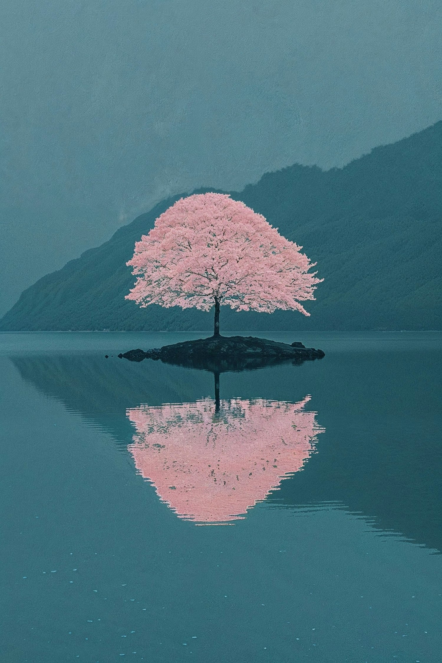 A stunning cherry blossom tree on an island reflects in a tranquil lake, surrounded by misty blue mountains, creating a serene scene.