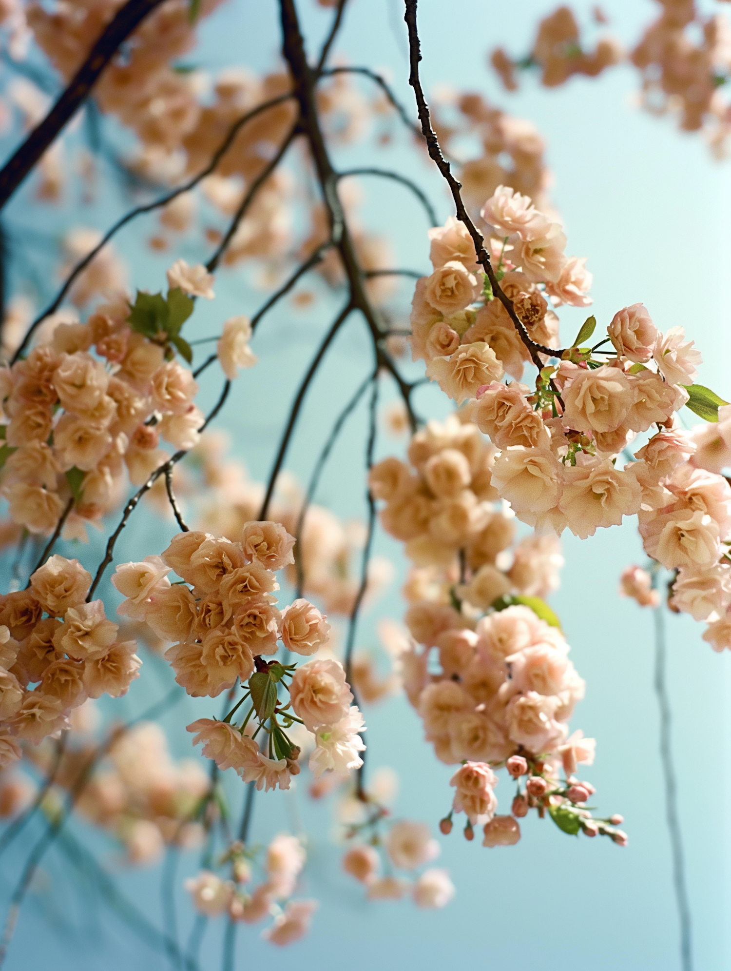 Peach blossoms on slender branches against a soft blue sky, creating a serene and vibrant floral scene.