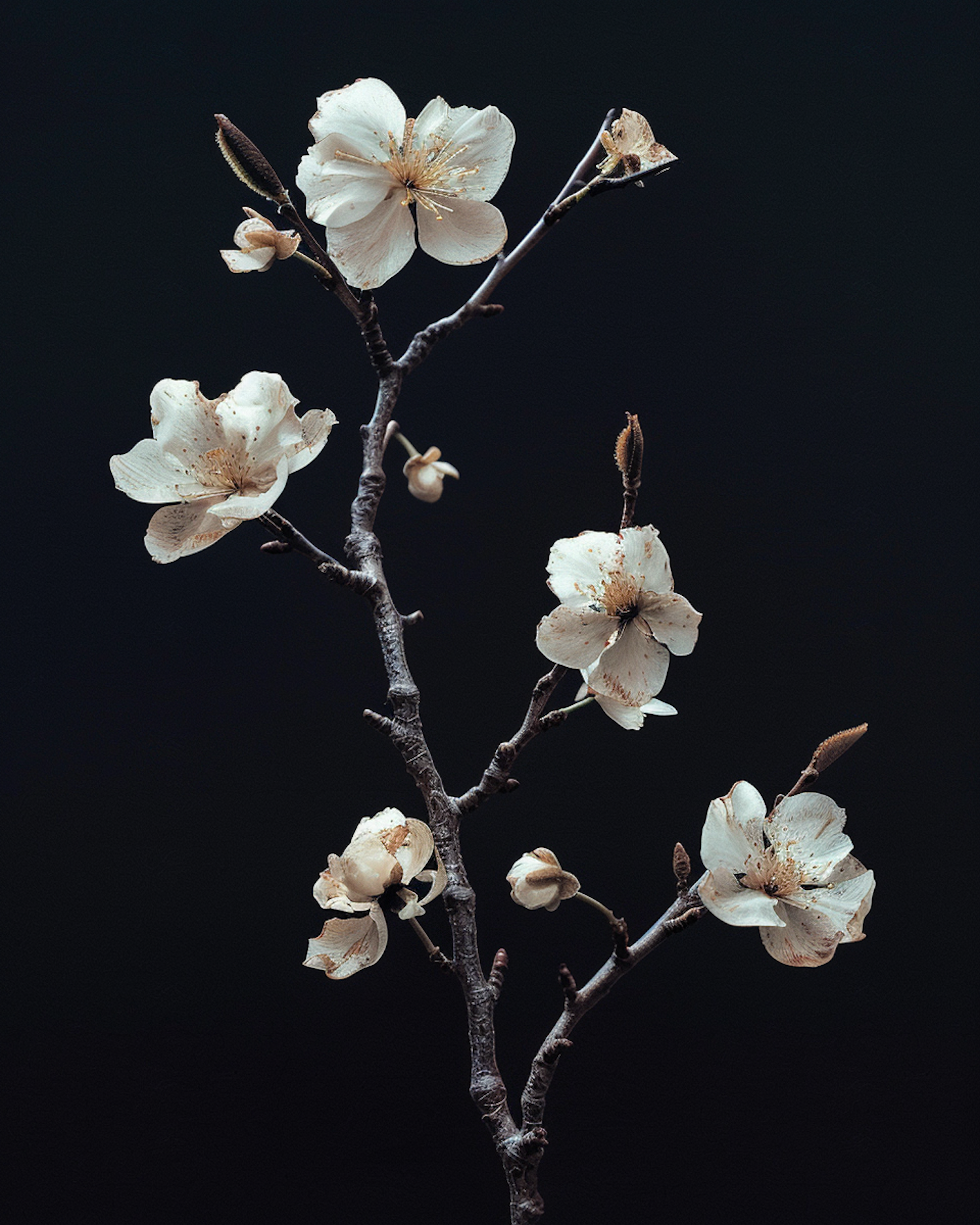 Elegant white blossoms on a slender branch against a dark background, showcasing nature's delicate beauty.