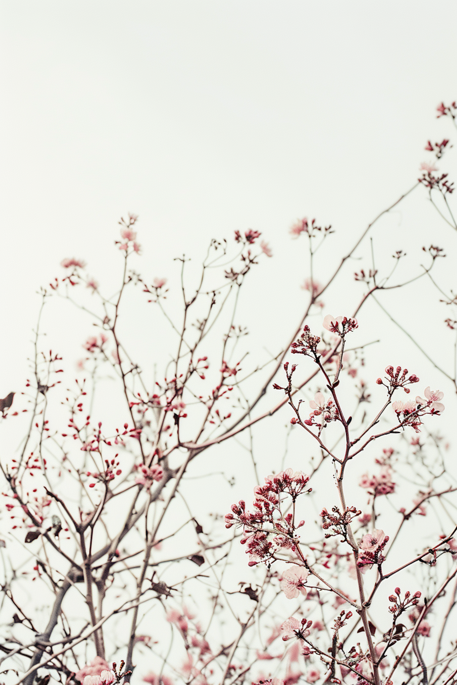 Delicate pink blossoms on spindly branches against a pale sky, creating a serene and airy springtime scene.