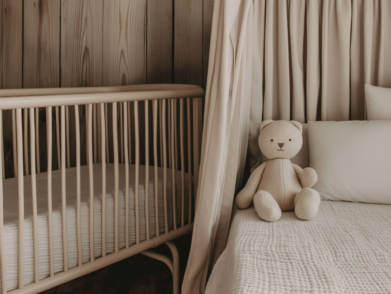 Cozy nursery with a wooden crib, cream quilt, and a plush teddy bear, creating a serene and inviting atmosphere.