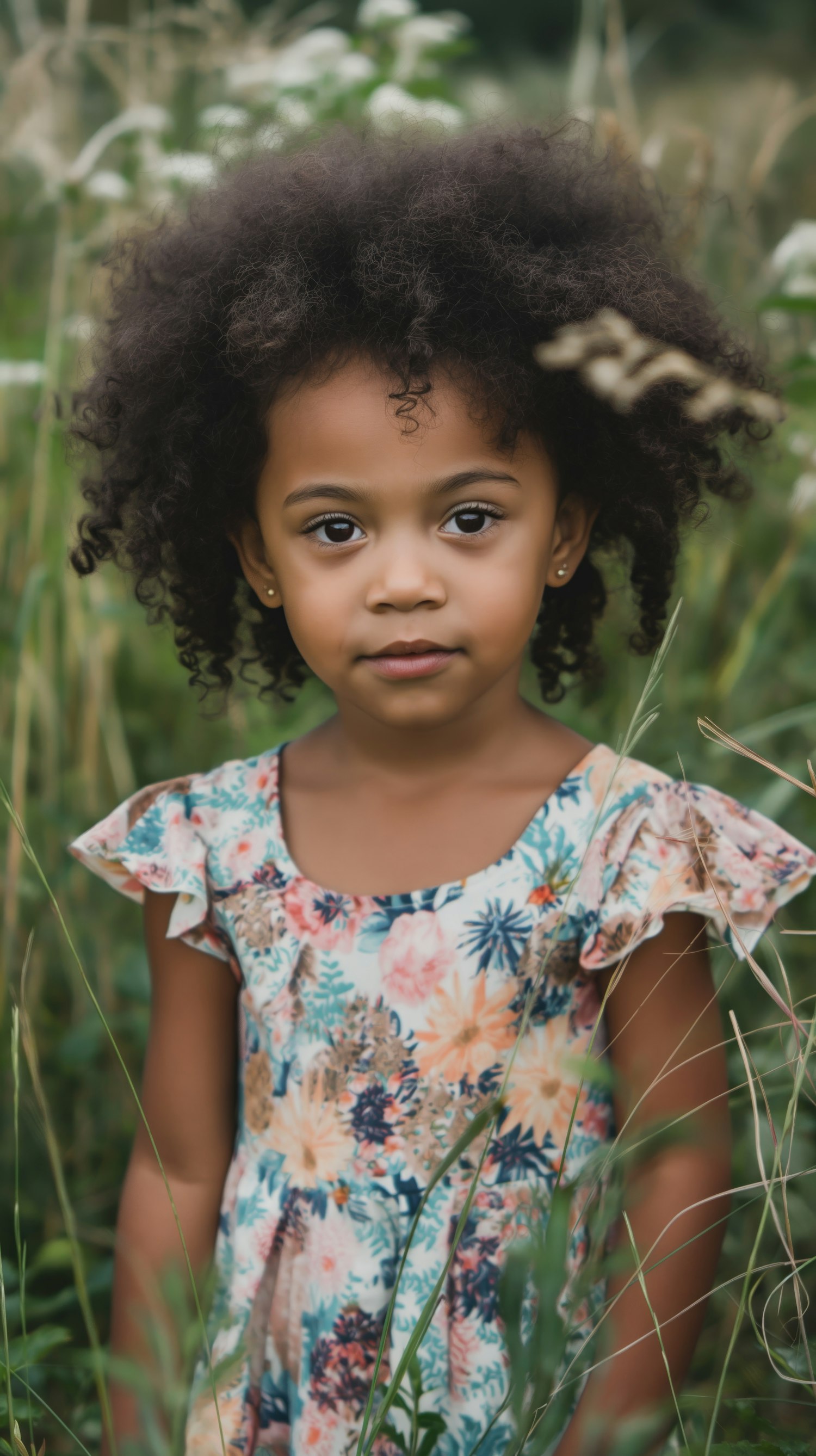 Young girl with curly hair in a floral dress stands in a field of tall grass and wildflowers, exuding a serene and natural beauty.