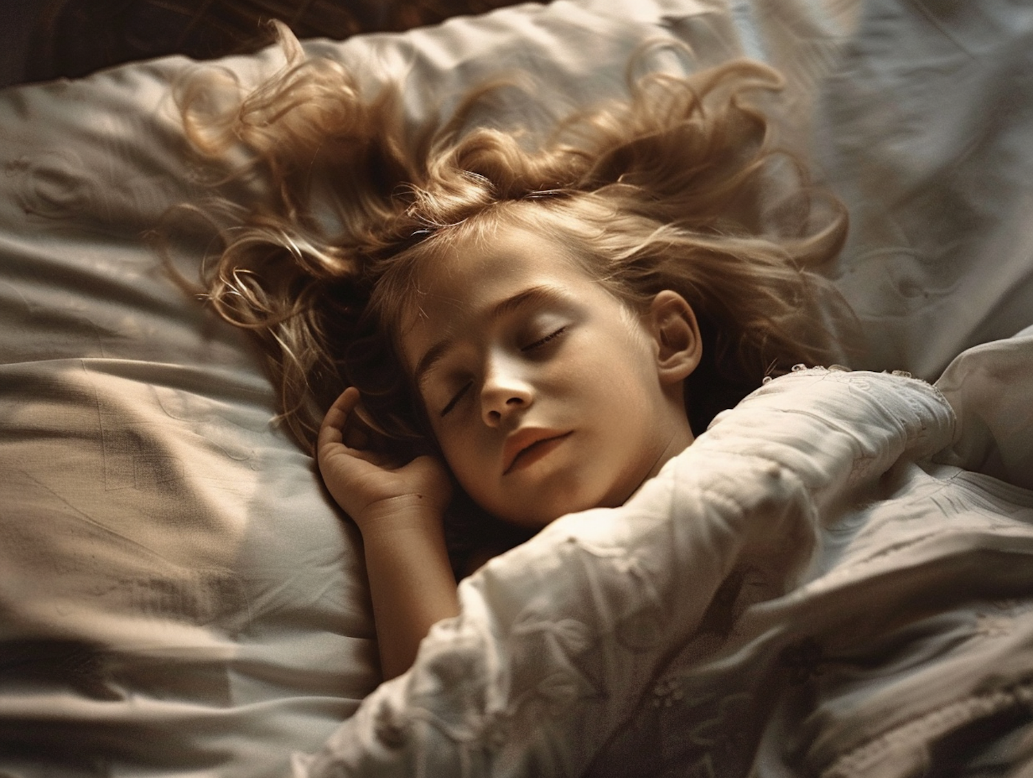 A young child with blonde hair peacefully sleeps under a white blanket, bathed in warm, gentle light.