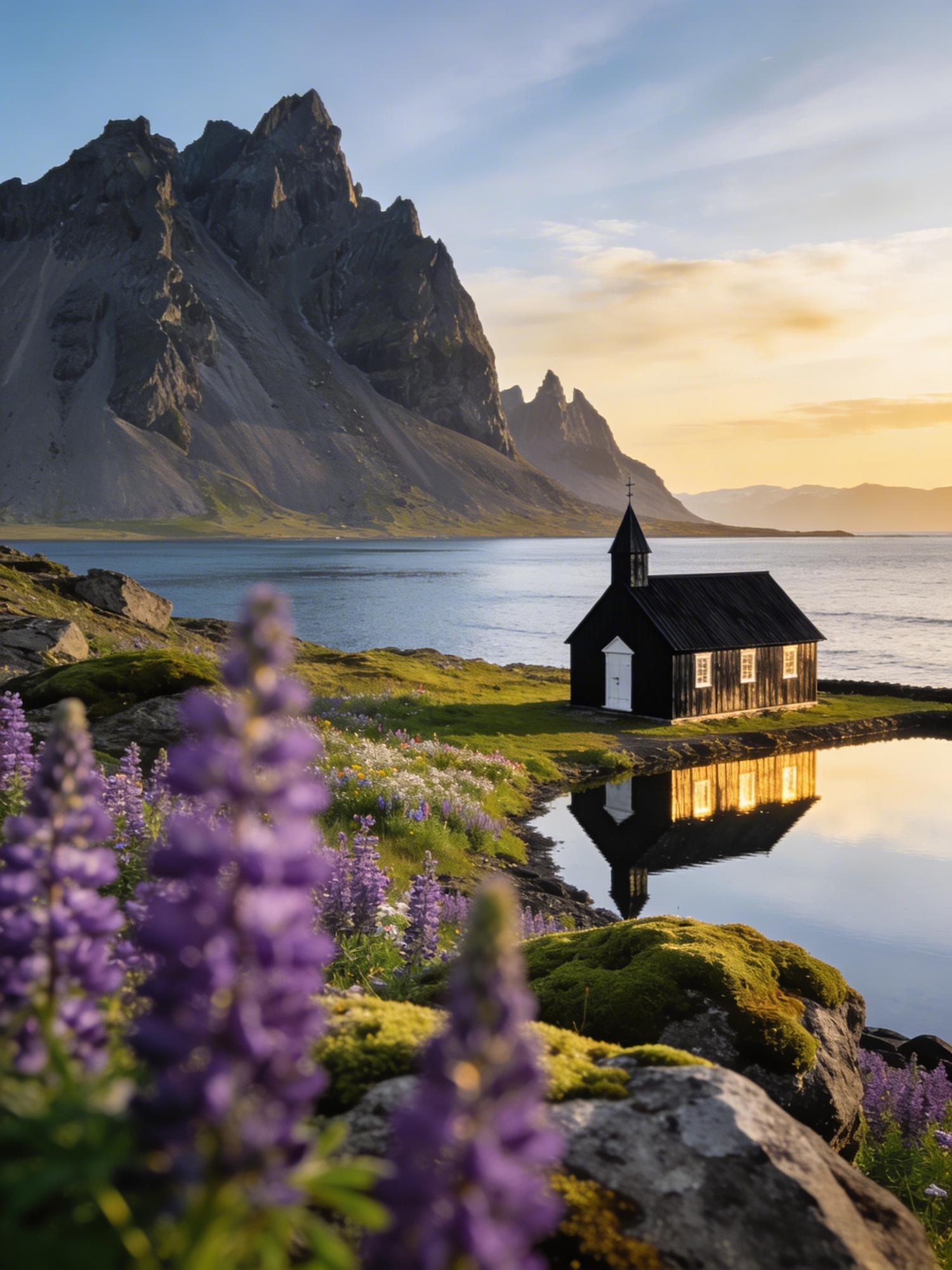 Ultra-realistic high-resolution travel photograph from a slightly elevated perspective, capturing an iconic Icelandic landscape with purple lupines and moss-covered rocks in the foreground, a small black wooden church near a reflective lake, and dramatic volcanic mountains rising in the distance. Warm golden-hour sunlight creates crisp highlights and realistic shadows across the church wood, rocky terrain, wildflowers, and calm water surface. The foreground is framed by softly out-of-focus lupines and moss textures, leading the eye toward the church on the right and the expansive landscape beyond. In the distance, rugged peaks stand beneath a pale gold and soft blue sky. The overall palette is cool yet natural, with deep moss green, purple lupines, black timber, silver-blue water, and warm evening sunlight. Ultra-detailed, photorealistic, sharp textures, realistic atmospheric depth, natural color grading, editorial travel photography, shot on a full-frame camera, magazine-quality realism, no painting, no illustration, no CGI. Extremely realistic travel photography, crisp fine detail, realistic shadows, true-to-life color, sharp architectural textures, natural optical depth, high-resolution full-frame camera image.