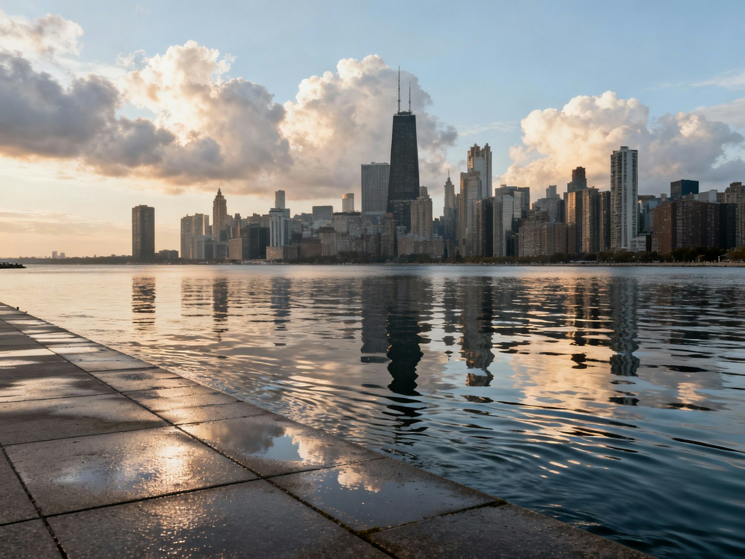 A stunning city skyline reflected in calm waters during a serene sunrise or sunset, with a wet tiled walkway in the foreground.