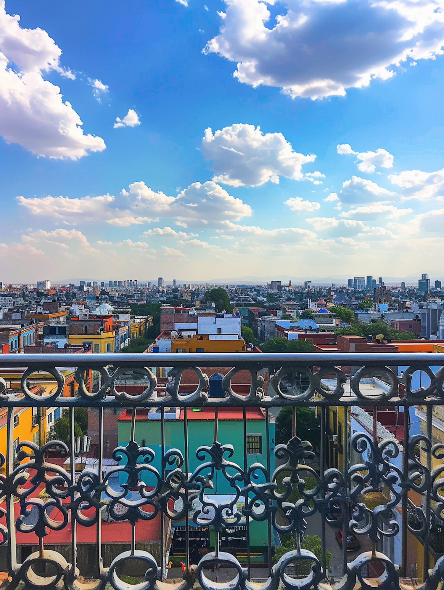 Vibrant cityscape with colorful buildings and ornate balcony under a bright blue sky with fluffy clouds.