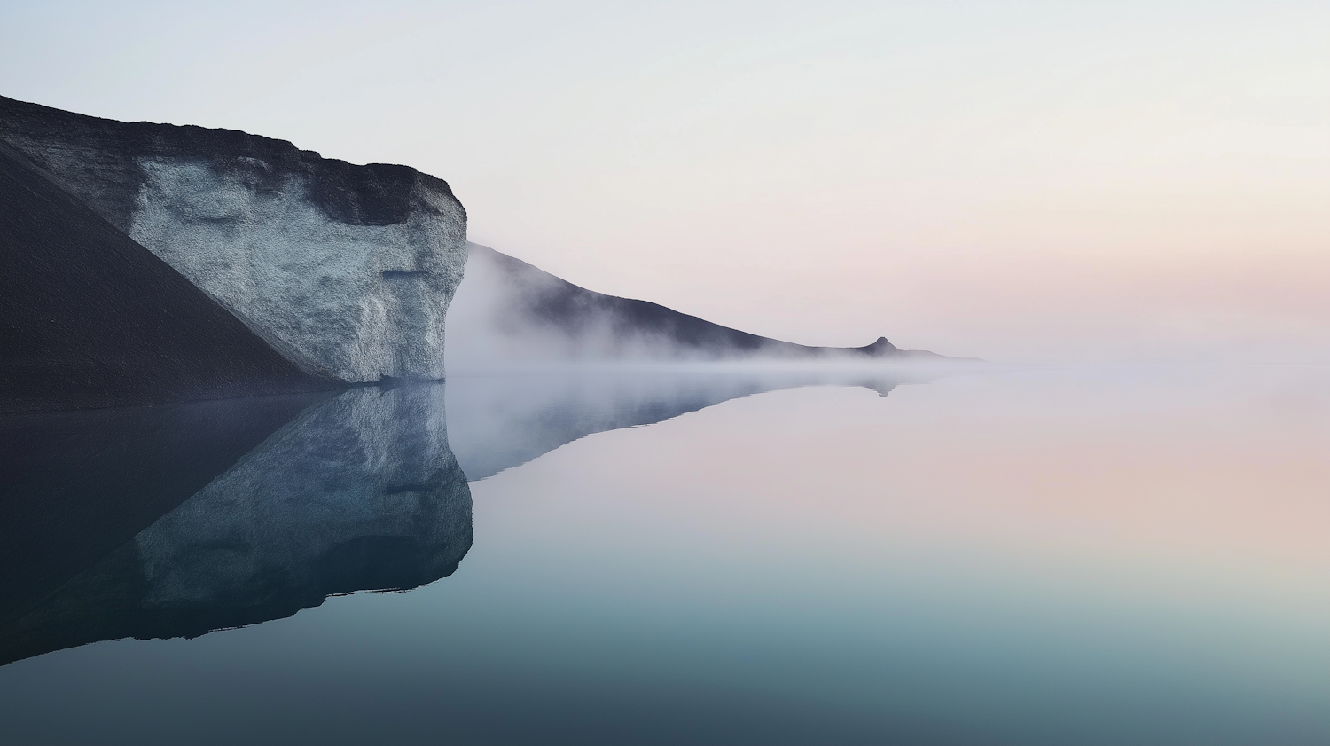 A tranquil scene of a misty lake reflecting a rugged cliff, with soft pastel skies creating a serene and dreamlike atmosphere.