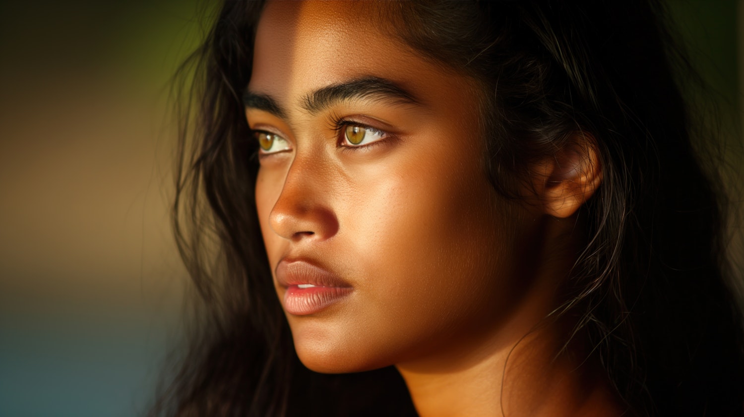Portrait of a young woman with long dark hair and hazel eyes, bathed in warm sunlight, creating a serene and contemplative mood.