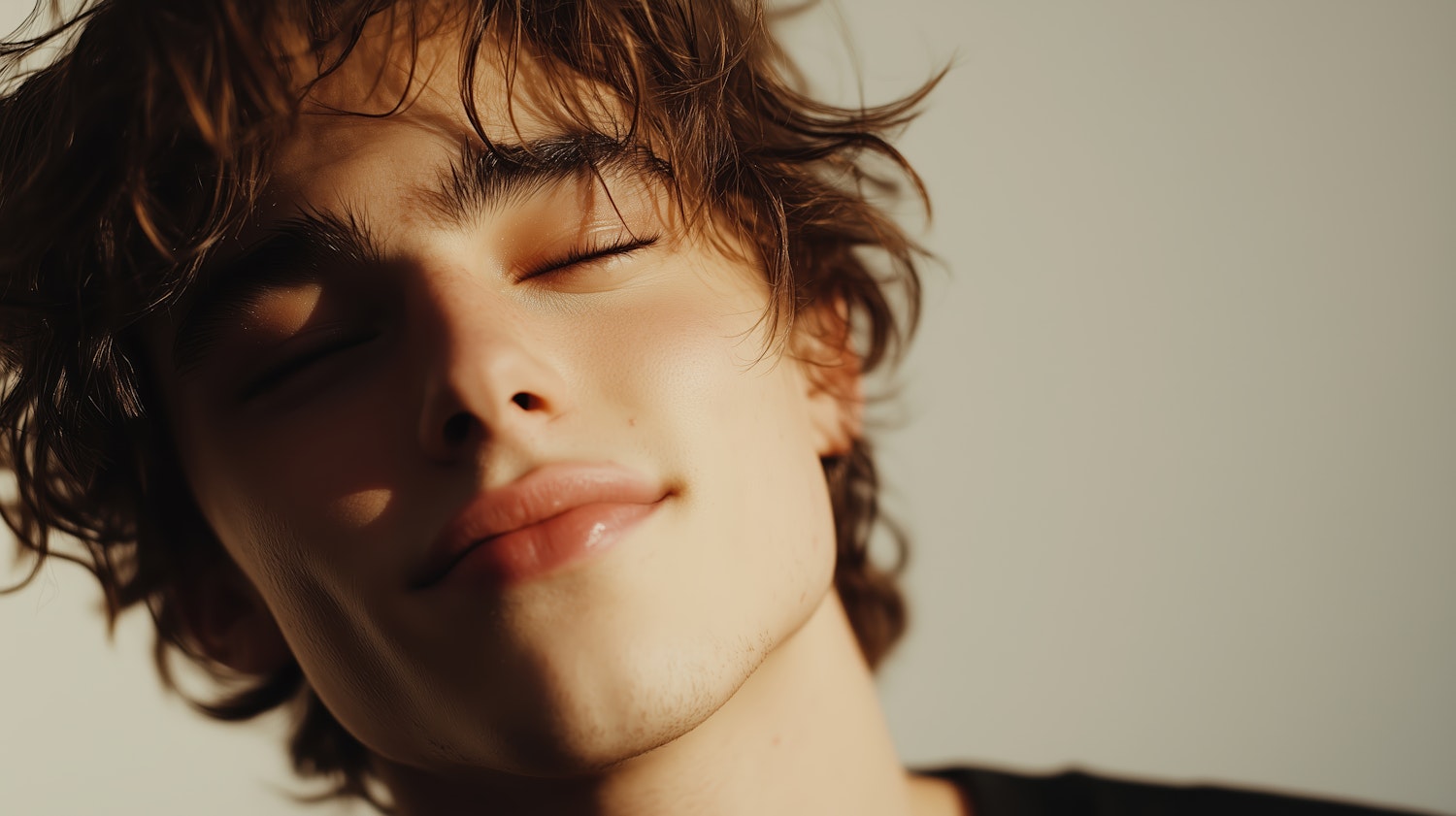 Close-up of a serene young man with tousled hair and closed eyes, bathed in warm light, exuding calm and relaxation.