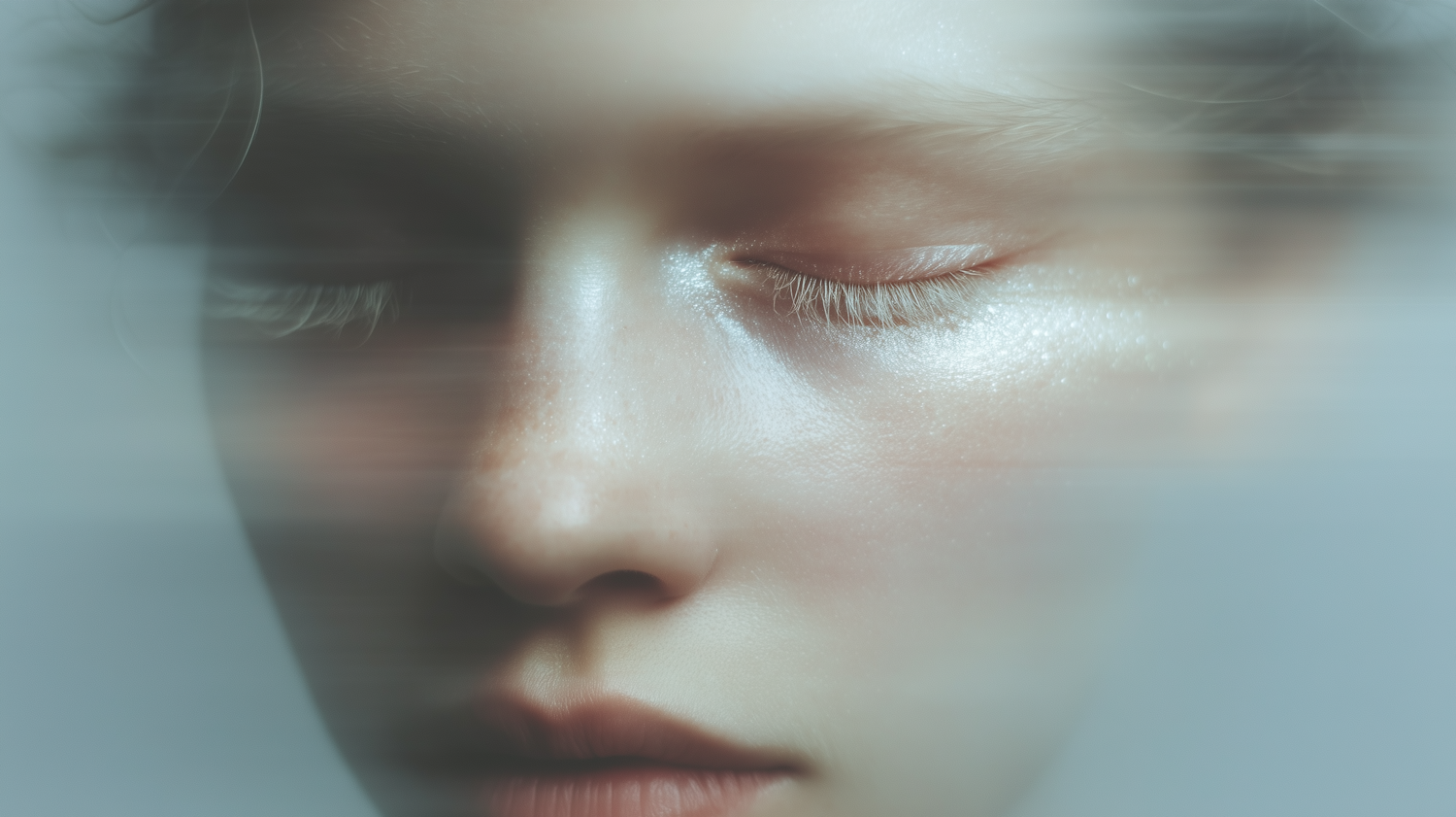 Dreamy close-up of a serene face with closed eyes, soft lighting, and blurred edges, evoking a sense of peace and introspection.