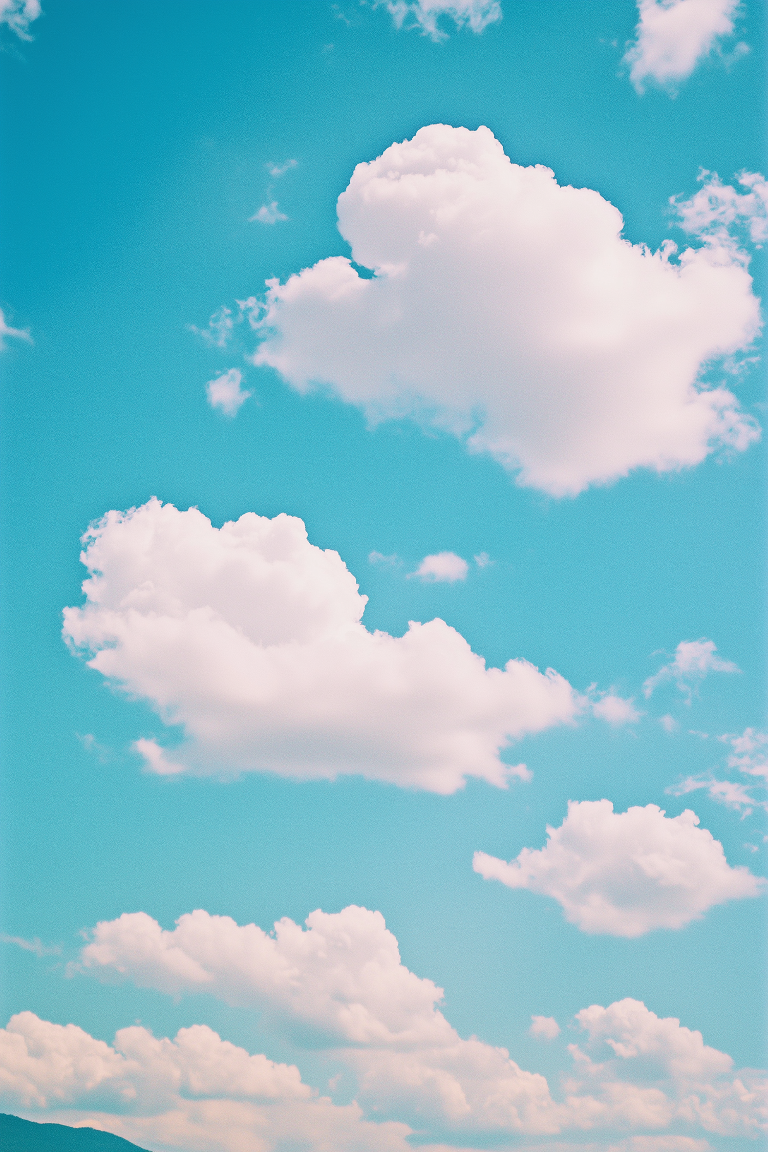 Bright blue sky with fluffy white clouds scattered across, creating a serene and peaceful atmosphere. A mountain range is faintly visible.
