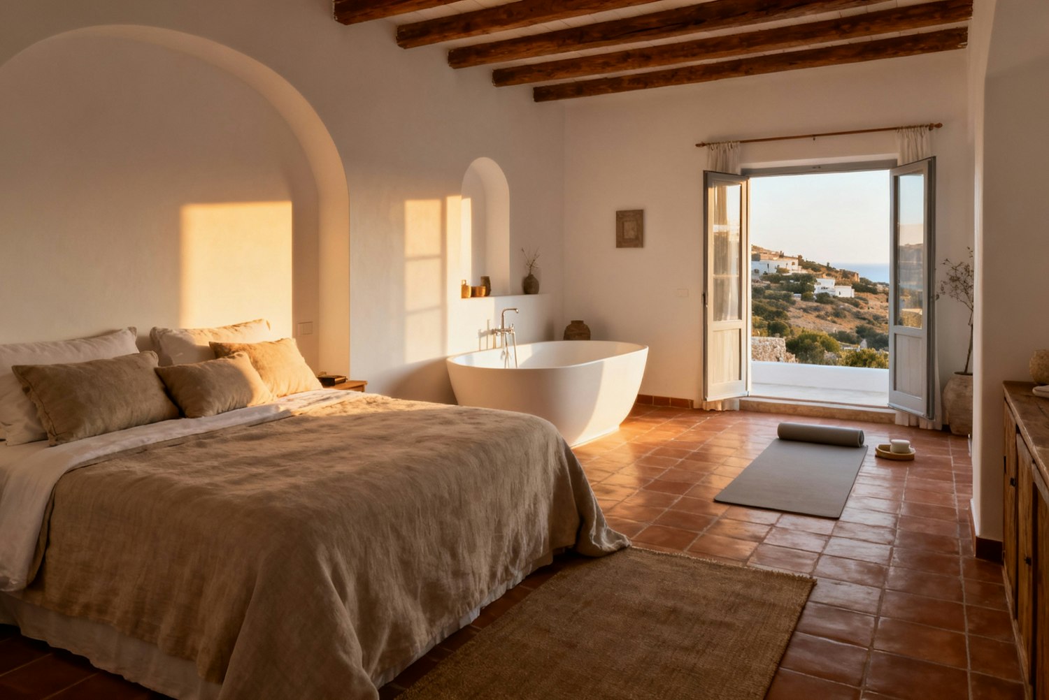 A cozy bedroom with a freestanding bathtub, terracotta tiles, and a view of a coastal village through open double doors.