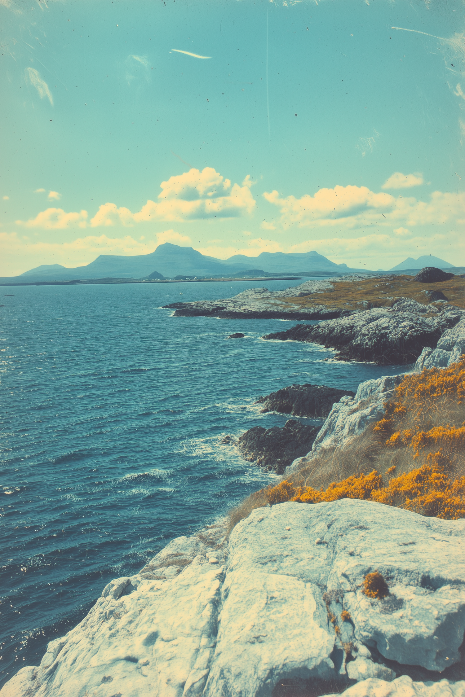 Breathtaking coastal view with white cliffs, yellow wildflowers, blue ocean, and distant mountains under a bright, cloud-dotted sky.
