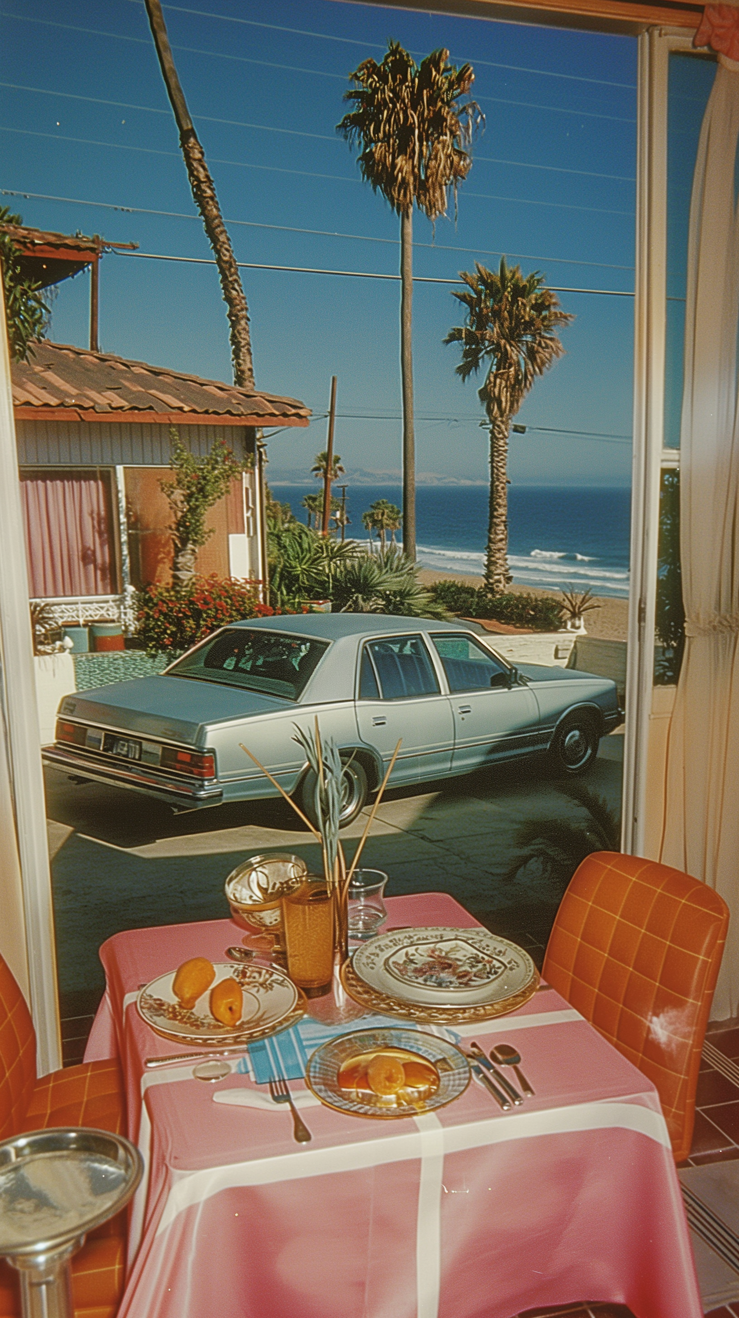 Vintage coastal view with a classic car, palm trees, and a beautifully set table by the window.