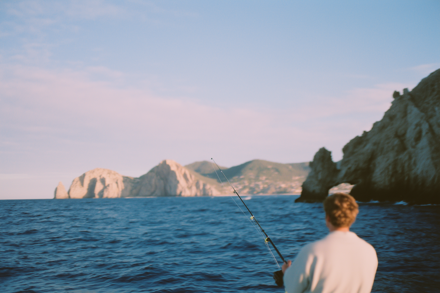 A person fishing on a calm ocean with scenic cliffs and a pastel sky in the background, creating a peaceful coastal vibe.