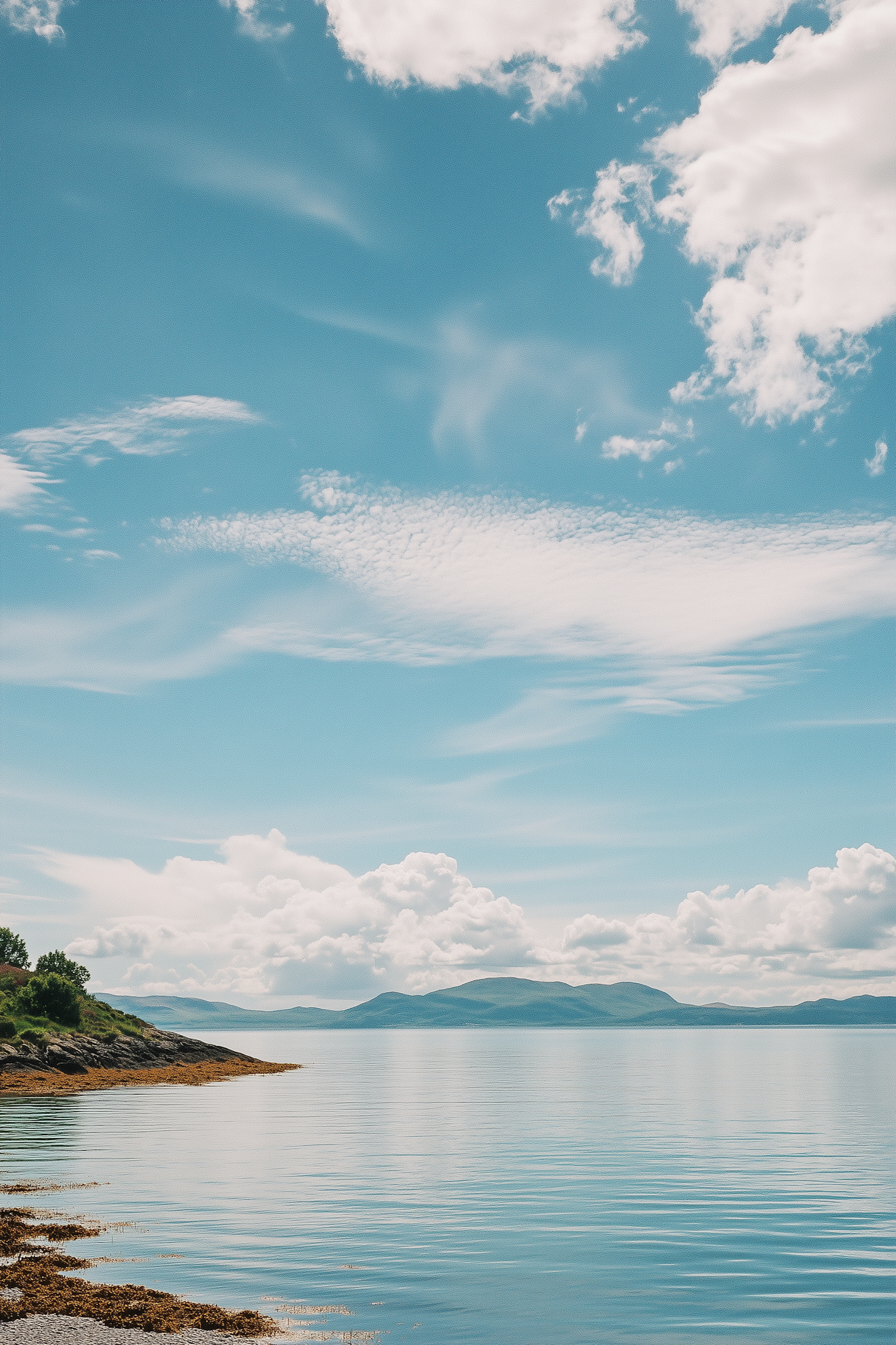 Tranquil coastal scene with calm waters, rocky shoreline, and rolling hills under a vibrant blue sky with scattered clouds.