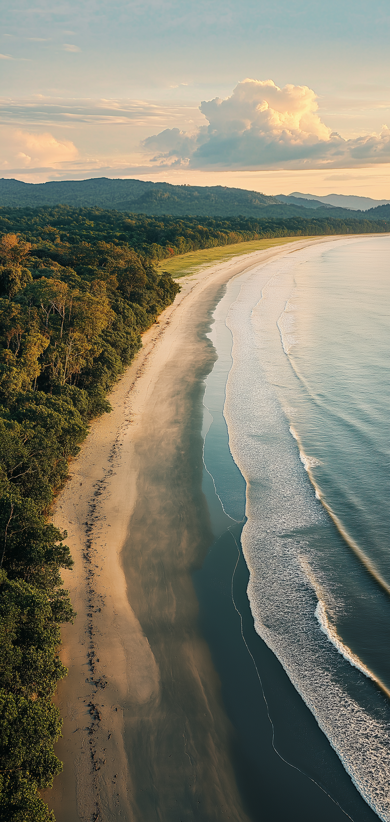 Aerial view of a tranquil beach with lush forest, gentle waves, and a warm sky, perfect for nature lovers and beach enthusiasts.