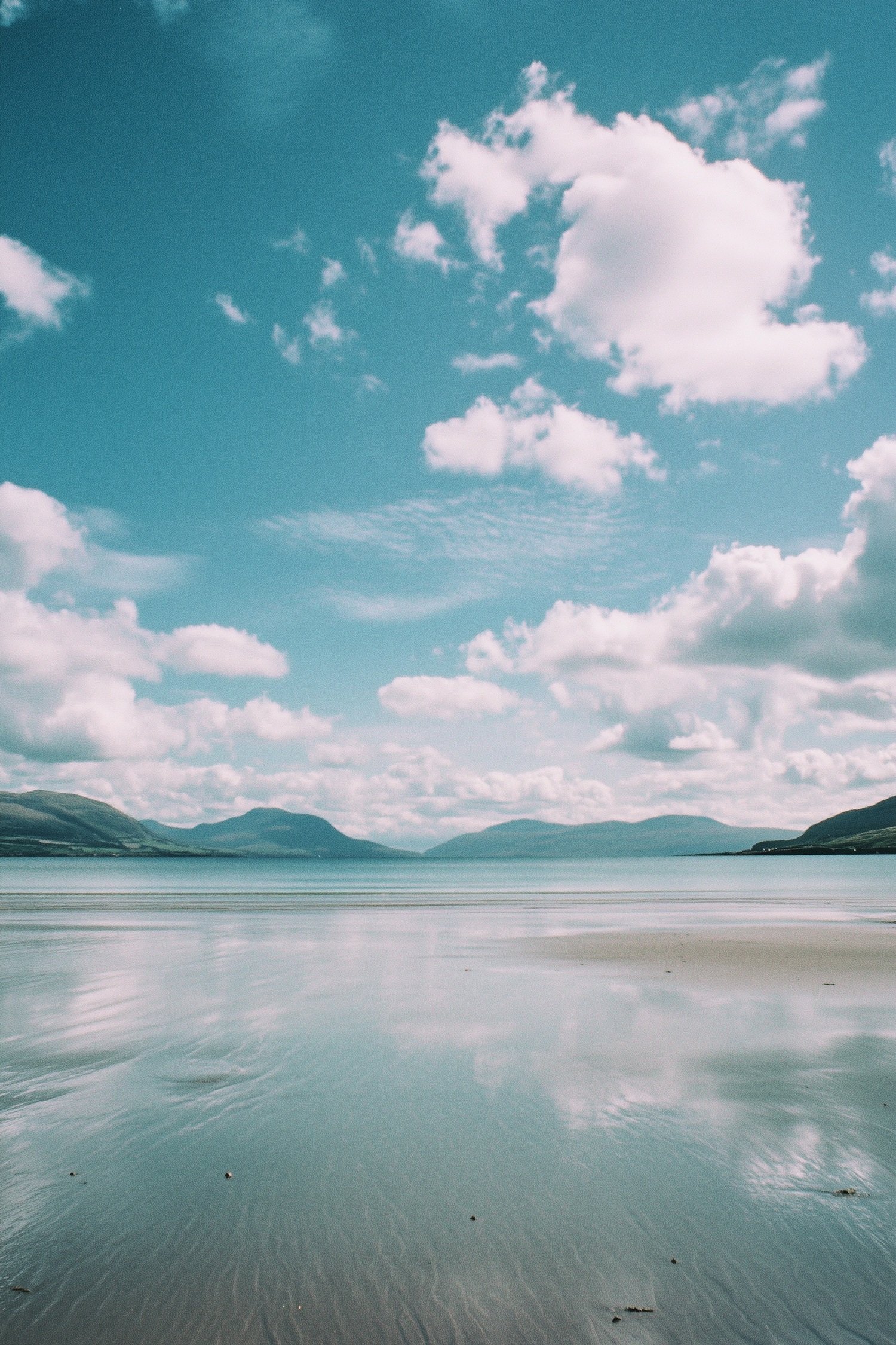 Tranquil coastal scene with blue skies, fluffy clouds, and reflective wet sand, framed by distant hills and calm waters.