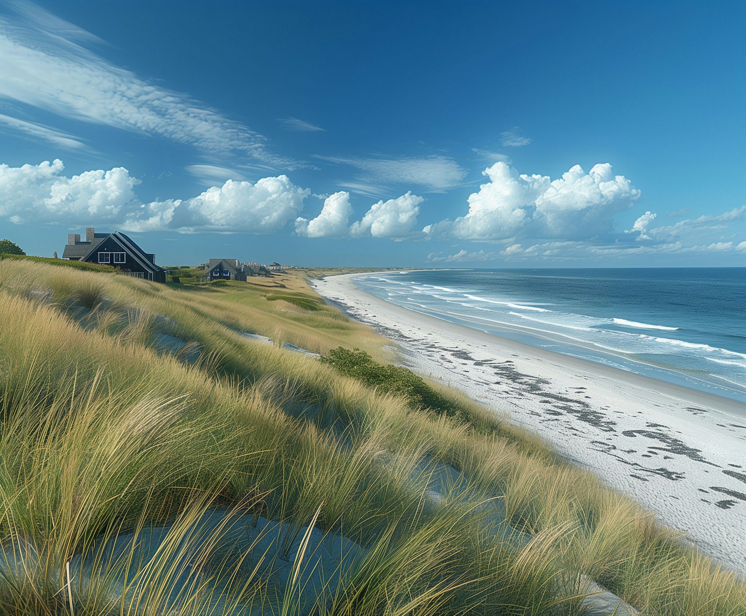 Tranquil beach scene with sandy shores, ocean waves, and beach houses under a blue sky with fluffy clouds.