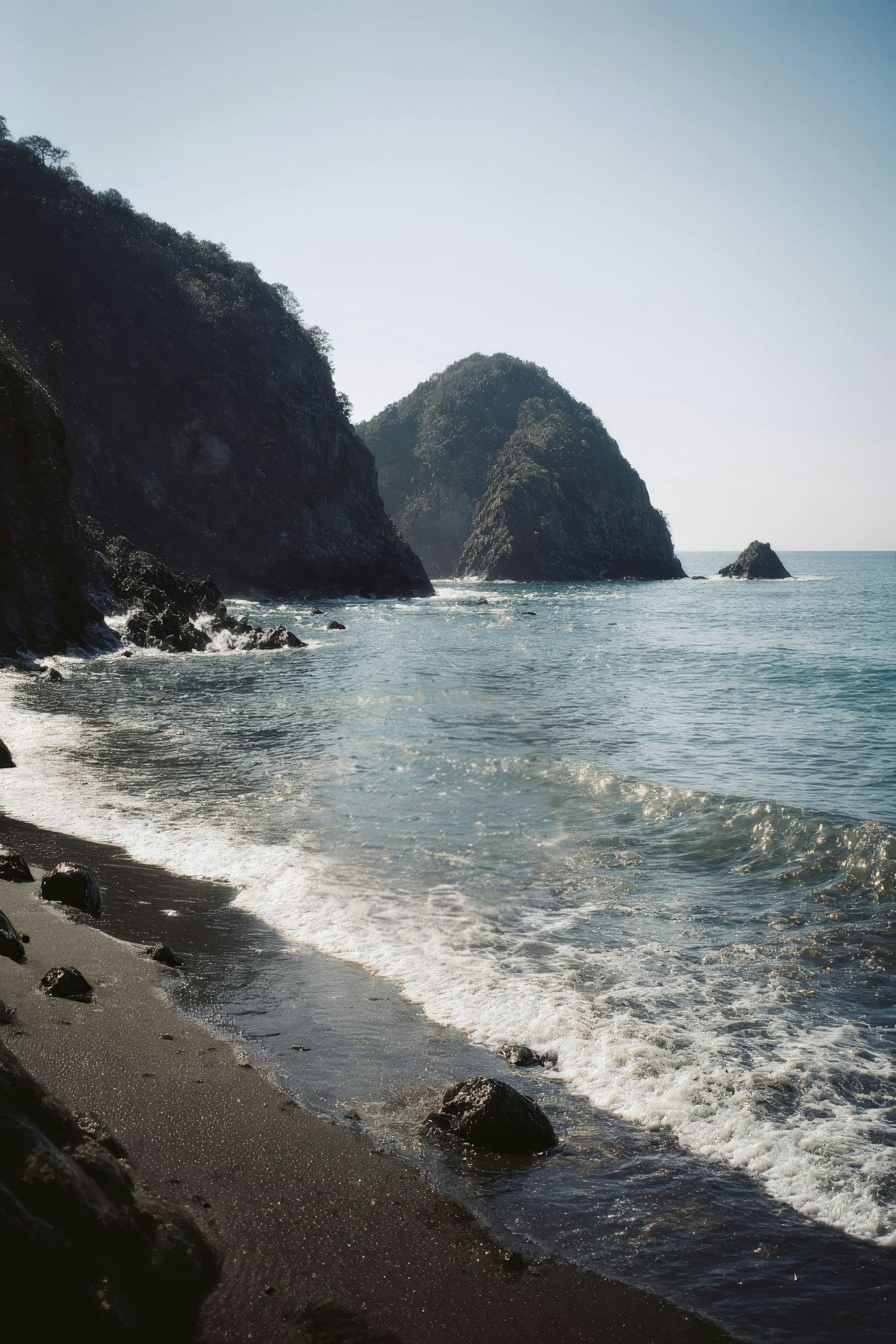 A tranquil black sand beach with rocky cliffs and gentle waves under a clear sky, perfect for nature lovers and coastal explorers.