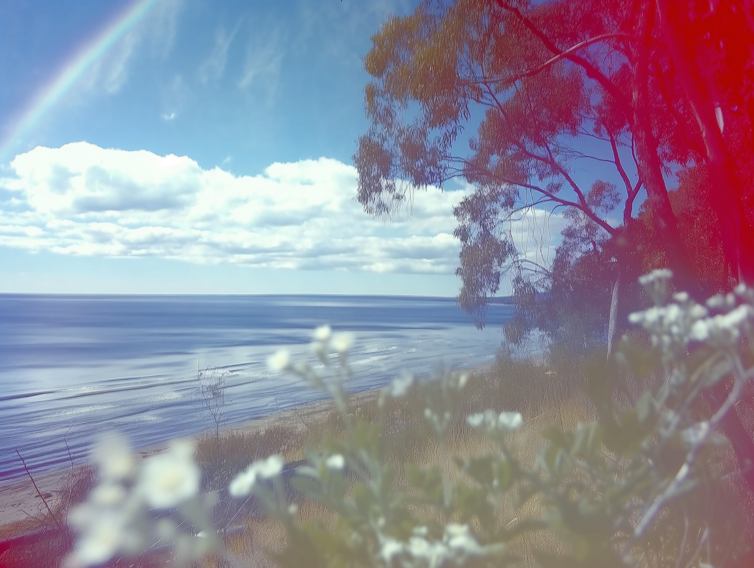 Serene coastal view with a rainbow, blue sky, and white flowers in the foreground, creating a tranquil and idyllic scene.