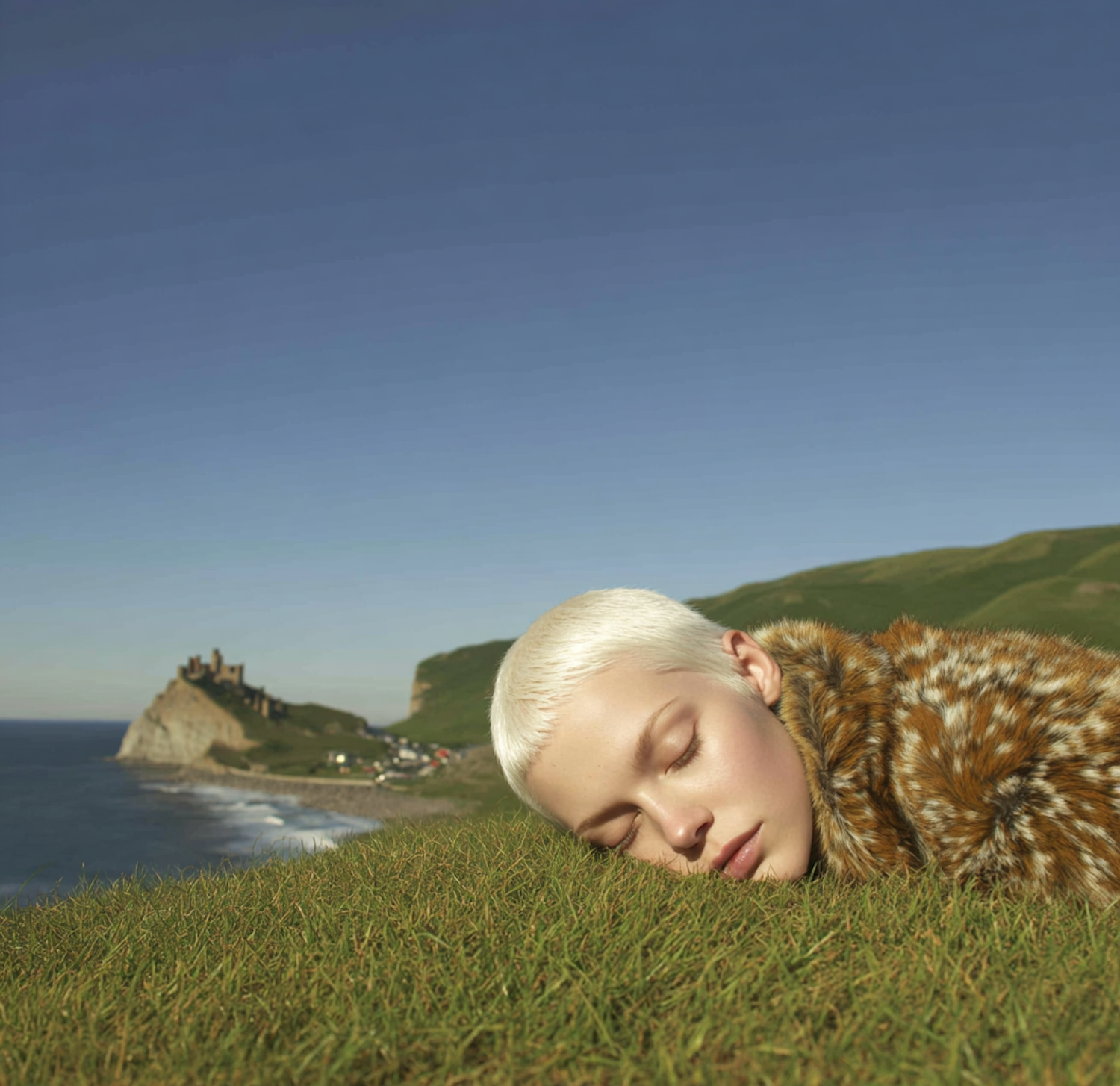 A serene portrait of a person resting on a grassy hill with a coastal castle in the background under a clear blue sky.