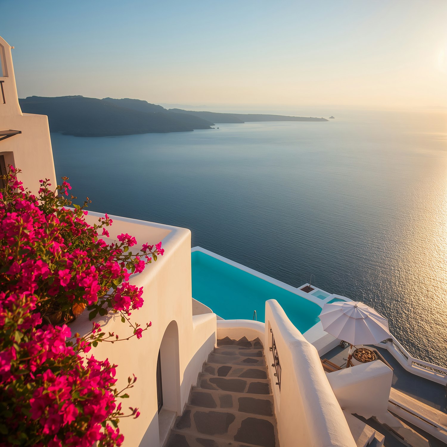 A stunning view of a whitewashed villa with pink flowers, an infinity pool, and a serene sea at sunset, perfect for a tranquil escape.