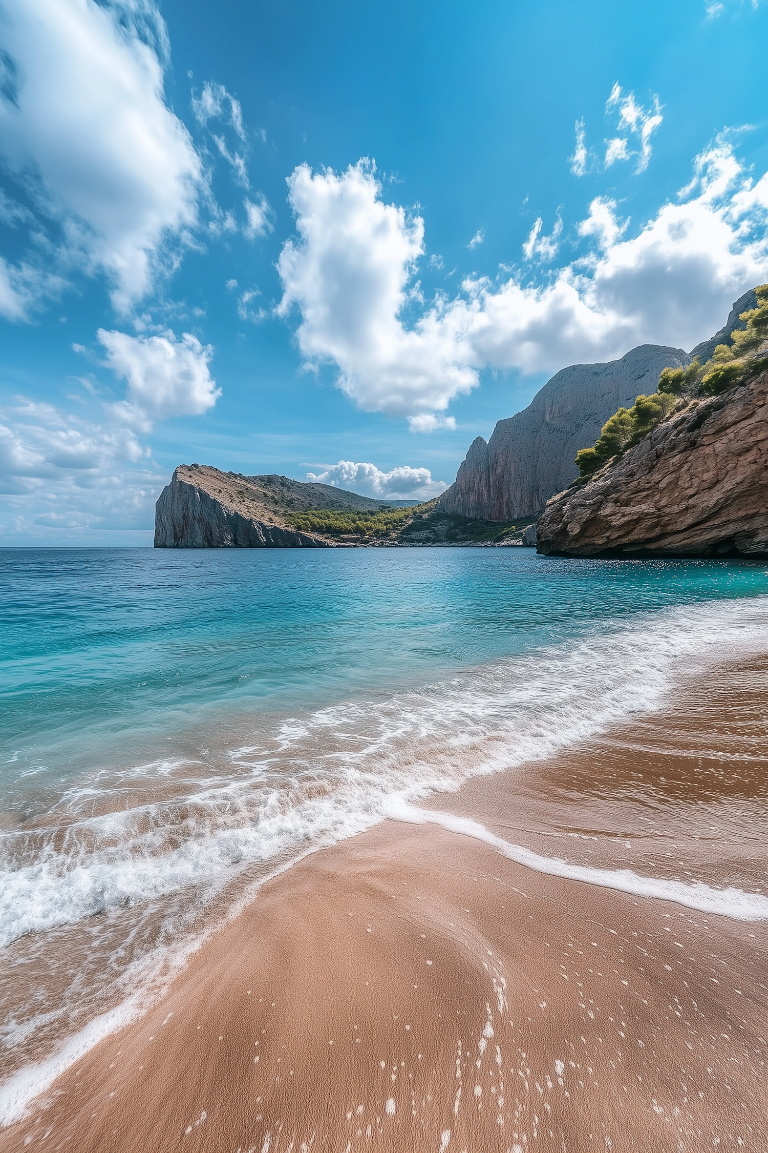 A tranquil beach with turquoise waters, rugged cliffs, and a vibrant blue sky dotted with fluffy white clouds. Perfect for a serene escape.