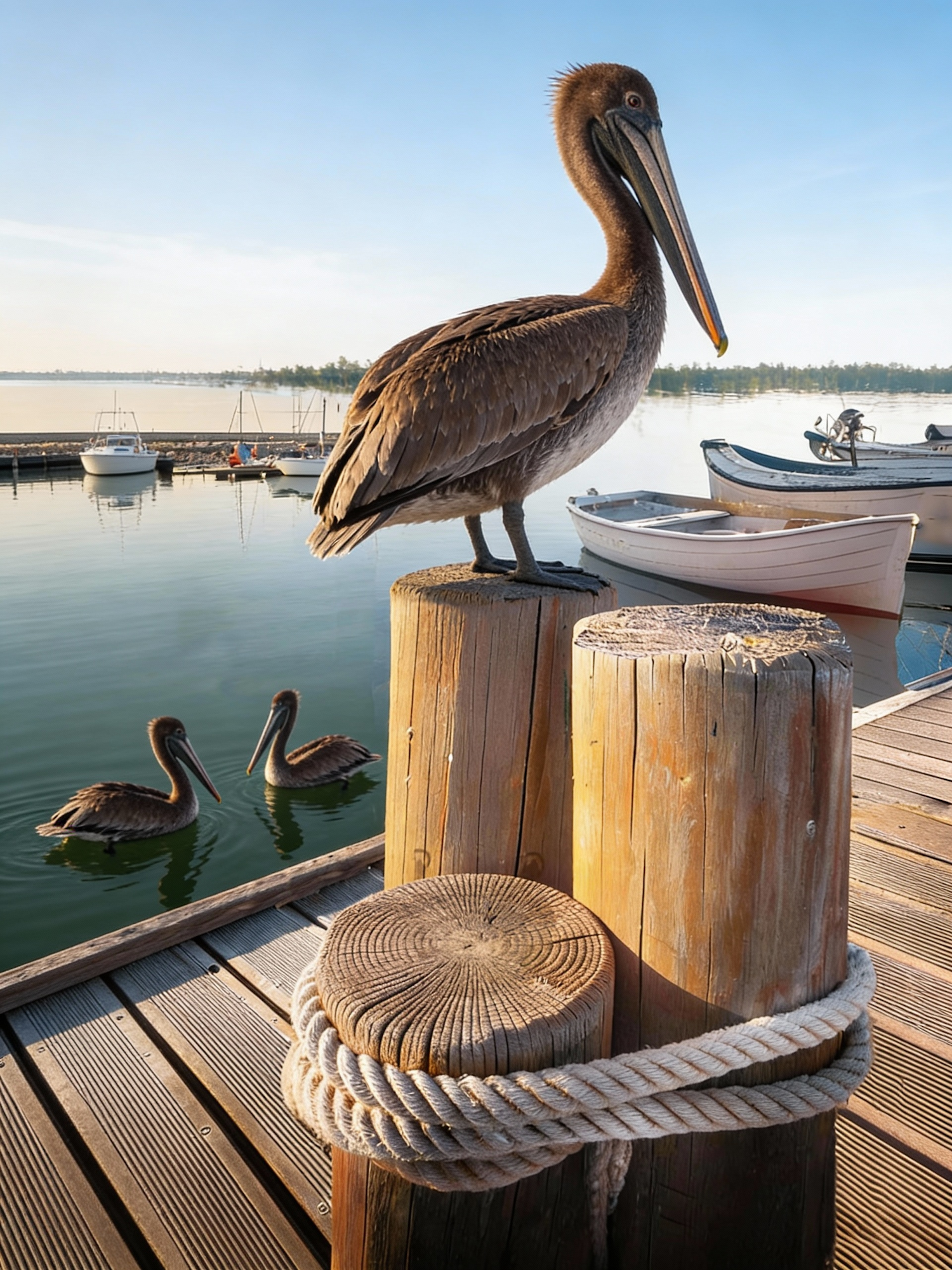 A pelican perched on a dock post with two others swimming nearby, set against a tranquil harbor with boats and calm water.
